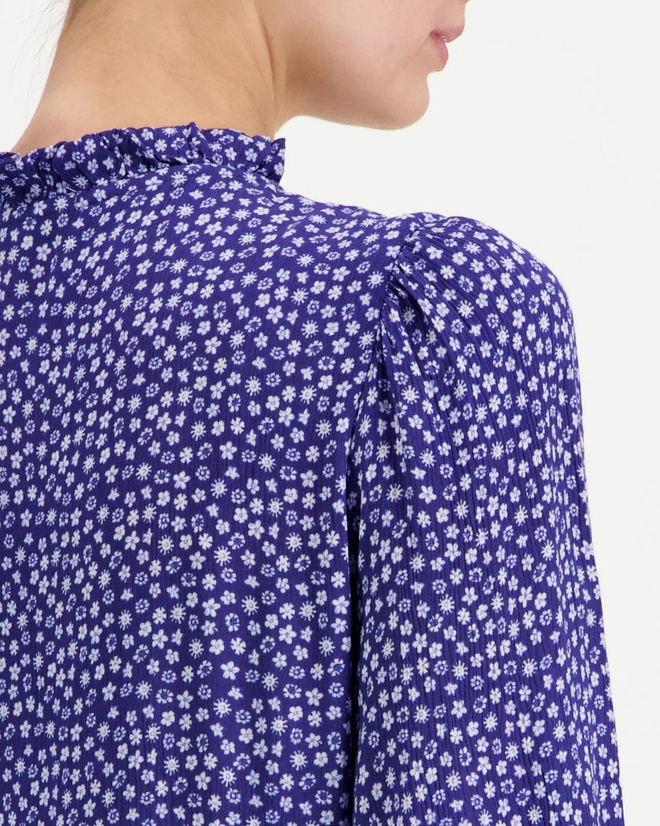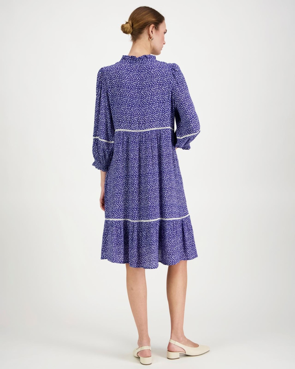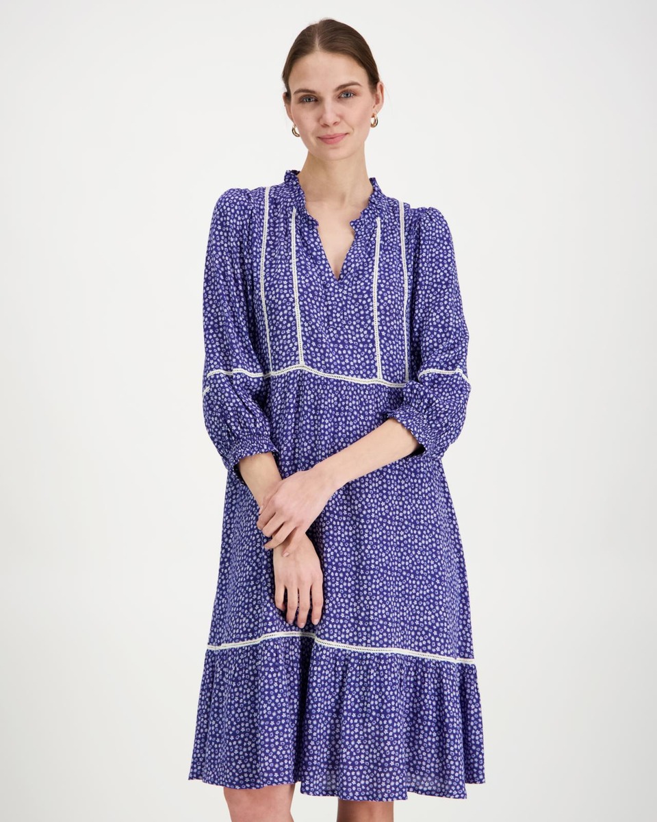 Romanttinen mekko kreppiviskoosista. Etuosalla, helmalla ja hihoilla kauniit reikäpitsit. Vajaamittaisilla hihansuilla elastiset smockrypytykset. Helmalla frilla.