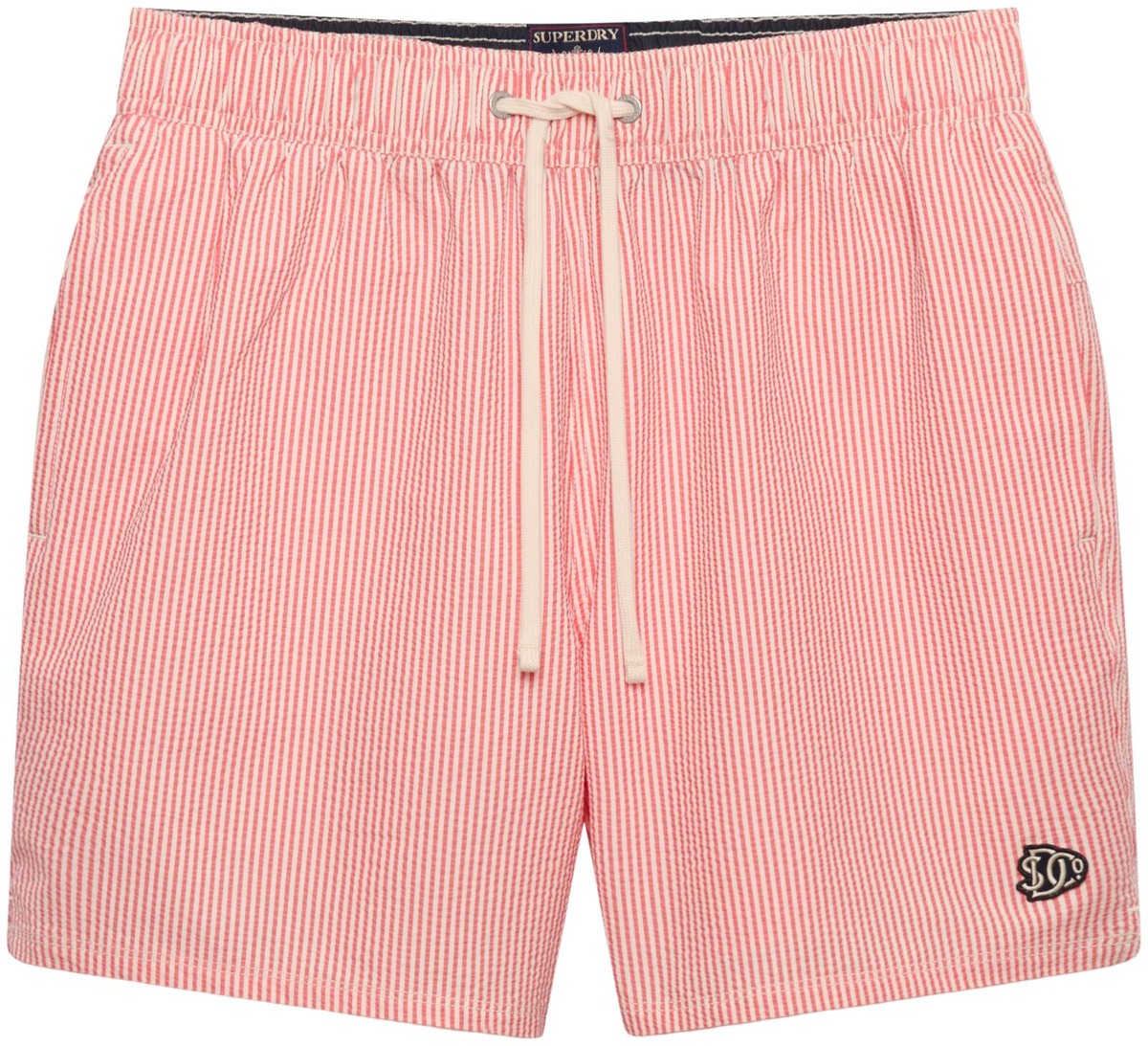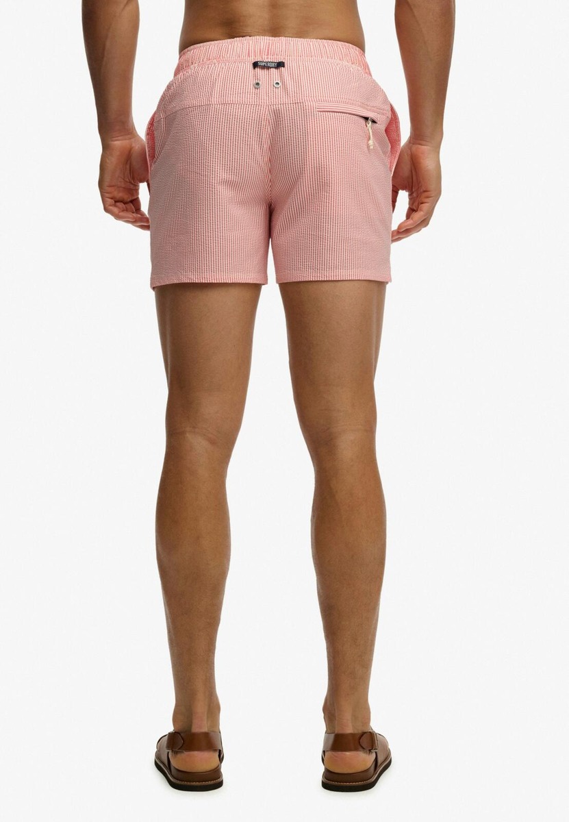 Kierrätysmateriaalista valmistetut Superdry uimashortsit. Uimashortseissa on solmittavat kiristysnyörit ja rennot sivutaskut sekä vetoketjullinen takatasku.