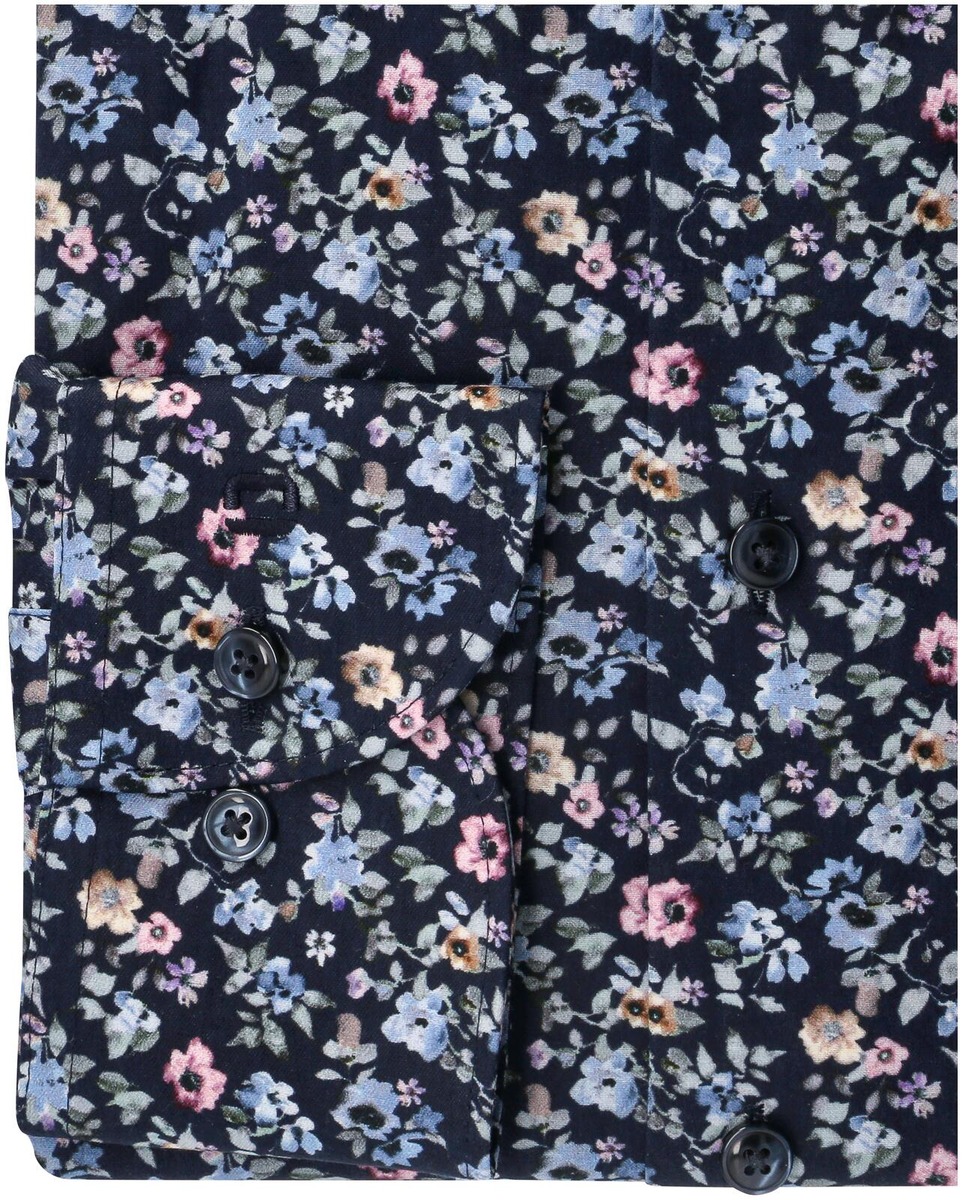 Näyttävässä Modern fit paidassa on heleä kukkaprintti tummalla pohjalla. Paidassa on tummansiniset napit, New Kent -kaulus, säädettävät mansetit ja muotolaskokset takana. Kuviollisessa paidassa ei ole rintataskua.