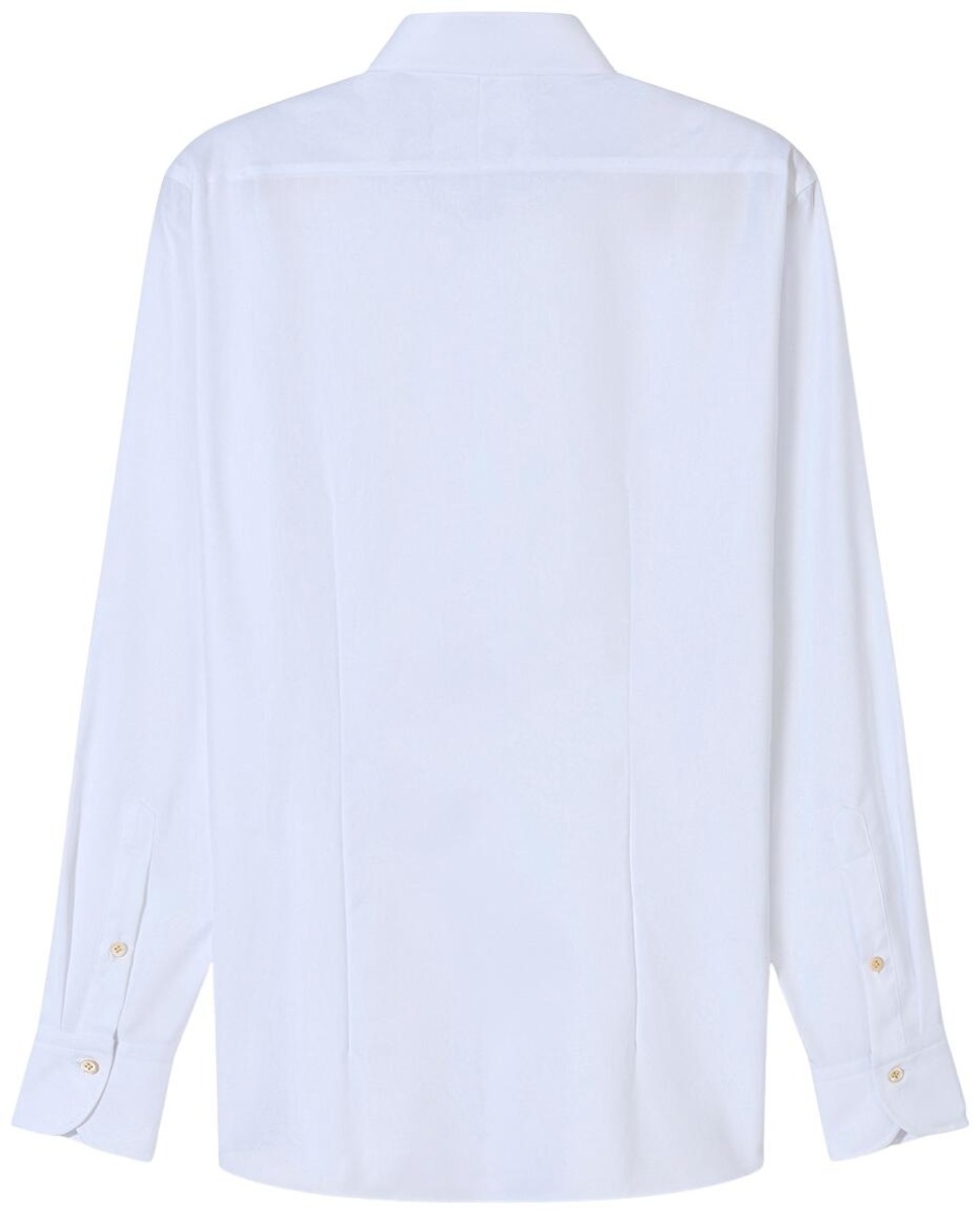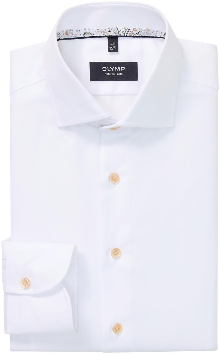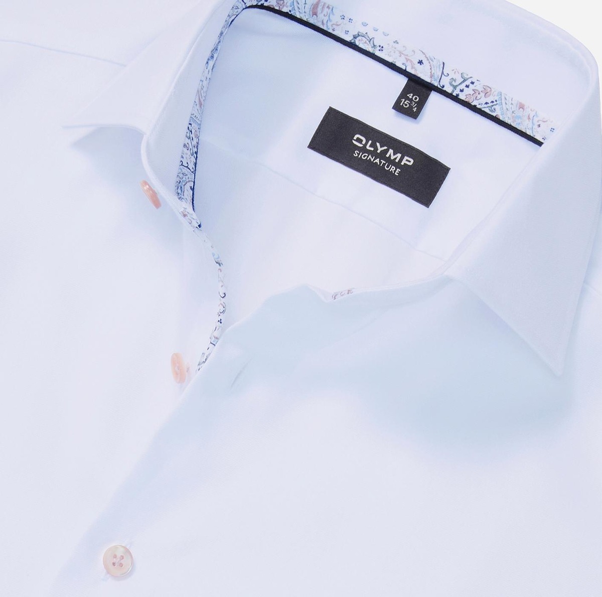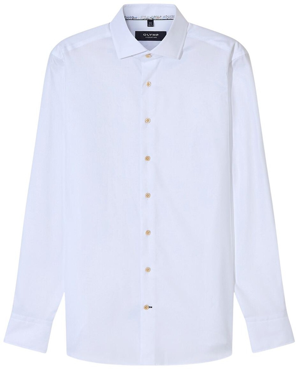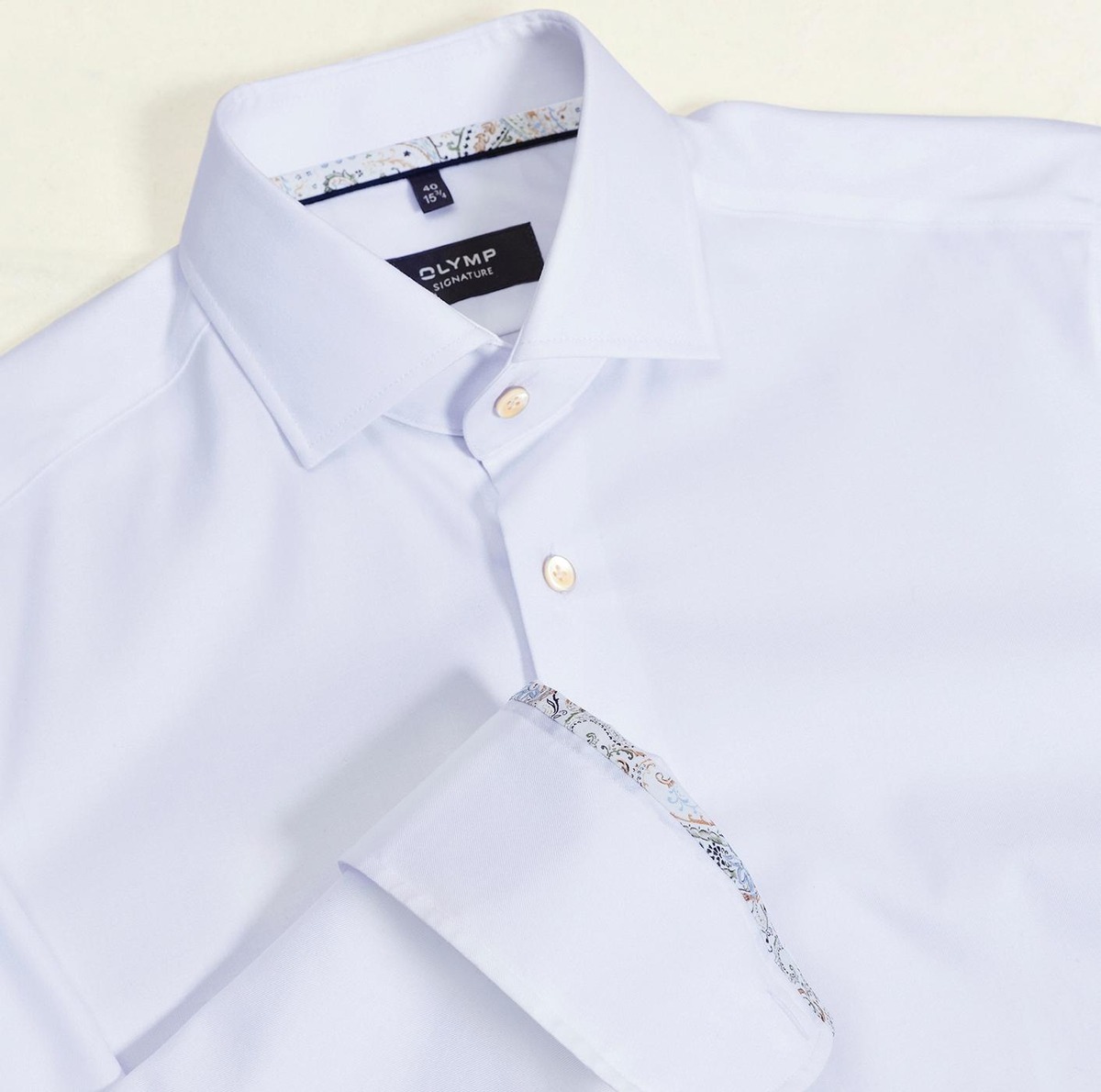 OLYMP SIGNATURE miesten premium-kauluspaita tyylikkääseen arkeen ja juhlaan. Paita on valmistettu hienosta twill-kankaasta (100 % puuvillaa), joka tarjoaa elegantin mattapintaisen kiillon ja ensiluokkaisen mukavuuden. Tailored fit -leikkaus, muotoon leikattu selkäkaarroke ja SIGNATURE Kent -kaulus ja käsin ommellut tasosaumat takaavat tyylin ja hyvän istuvuuden. Yksityiskohtina vaaleanbeiget helmiäisnapit ja hillityt kontastiviimeistelyt sisäpuolella.