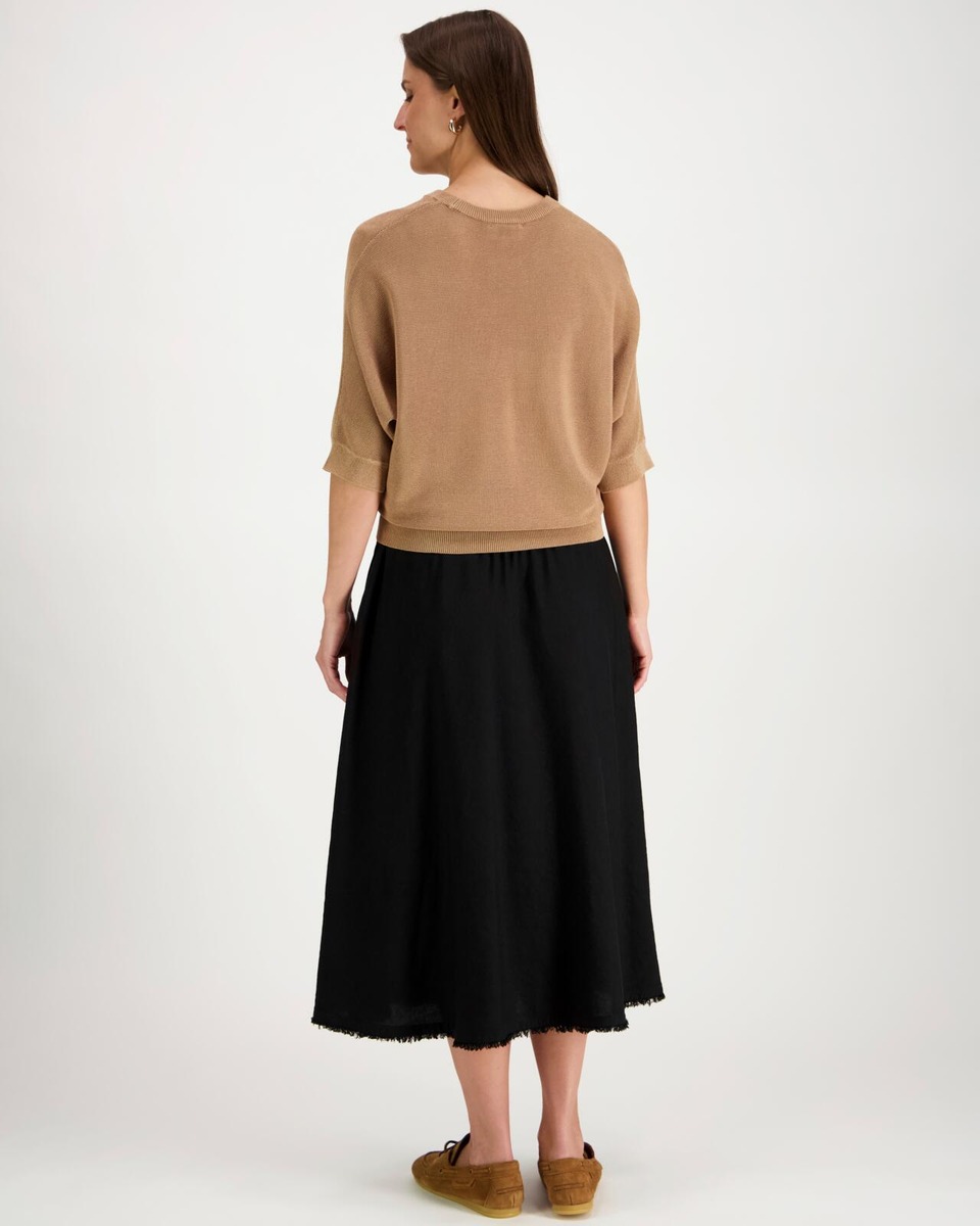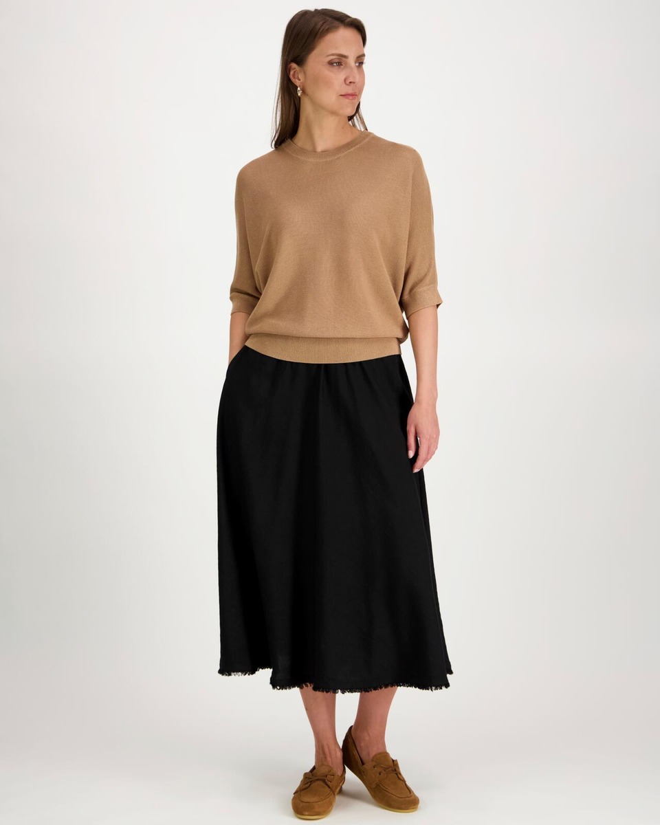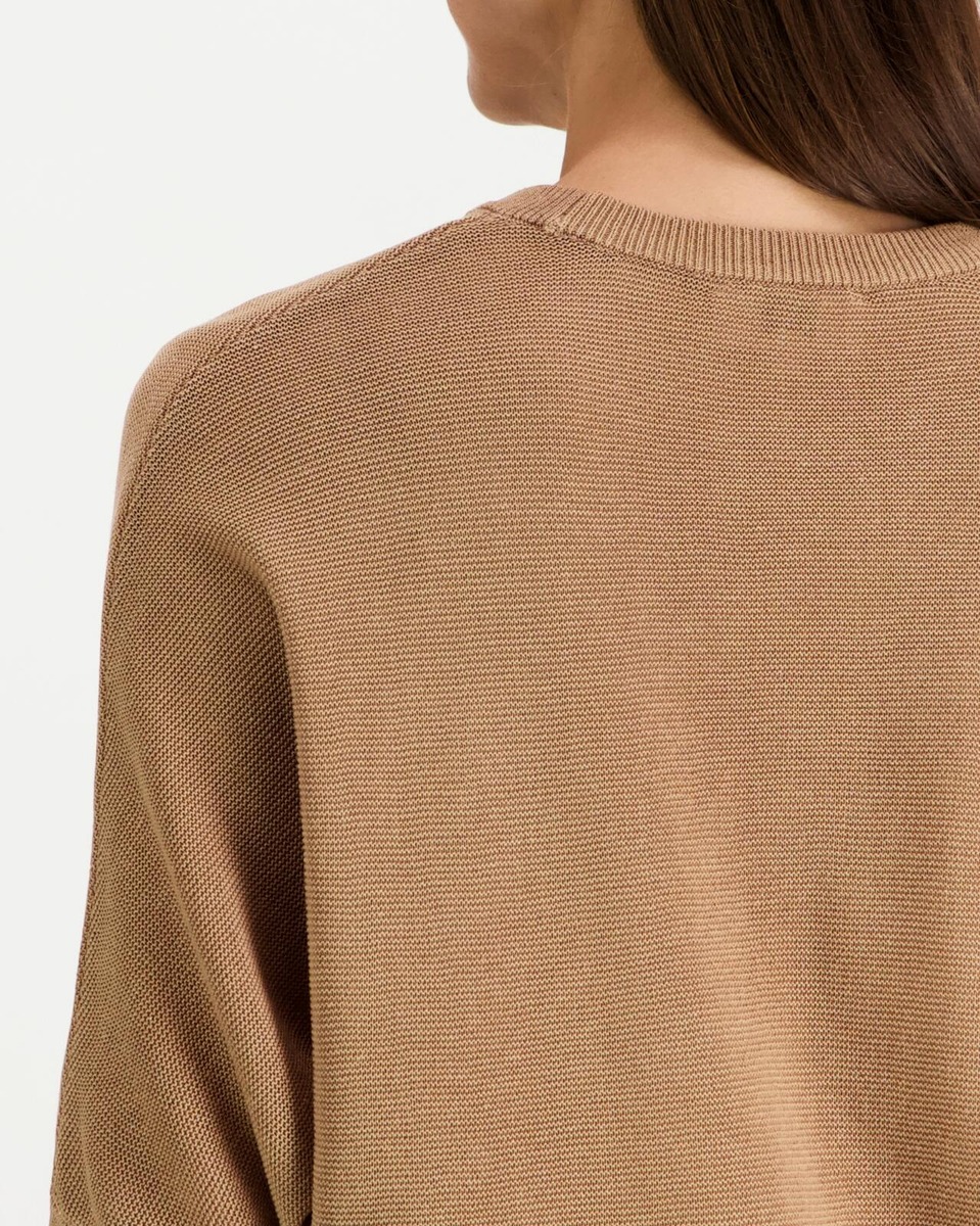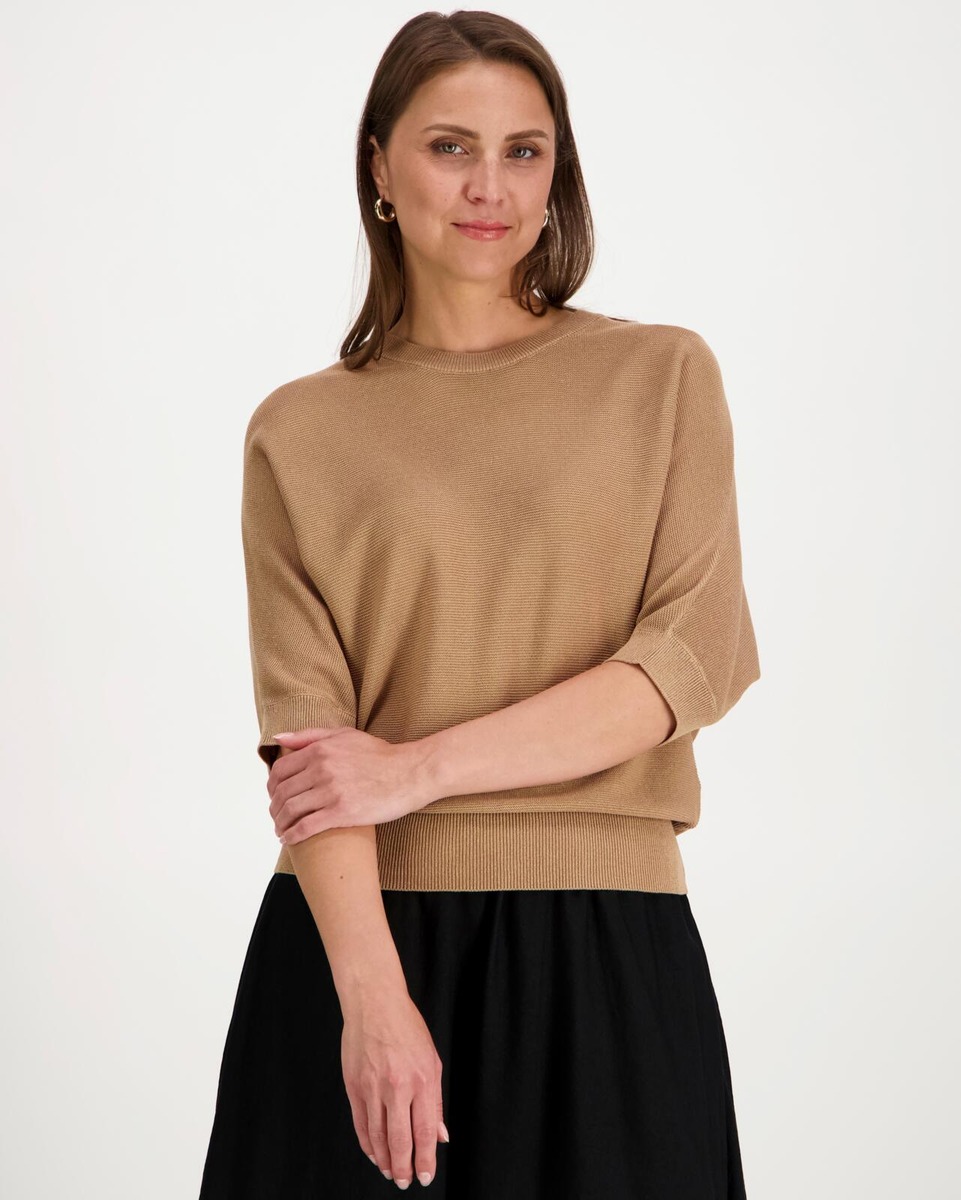 Aventuran kevyessä neuleessa on hieman kimonomaiset vajaamittaiset hihat. Koossa M rinnanympärys noin 110 cm ja pituus olalta helmaan noin 57,5 cm.