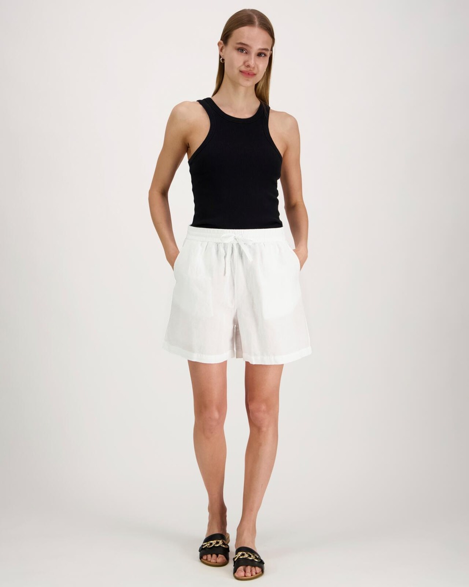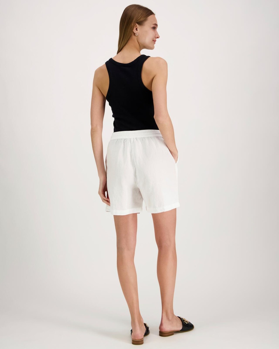 Löysästi istuvat pellavasekoiteshortsit, joissa on joustava vyötärönauha ja etuosassa kalanruotokuviollinen kiristysnauha sekä pienet halkiot sivuilla.