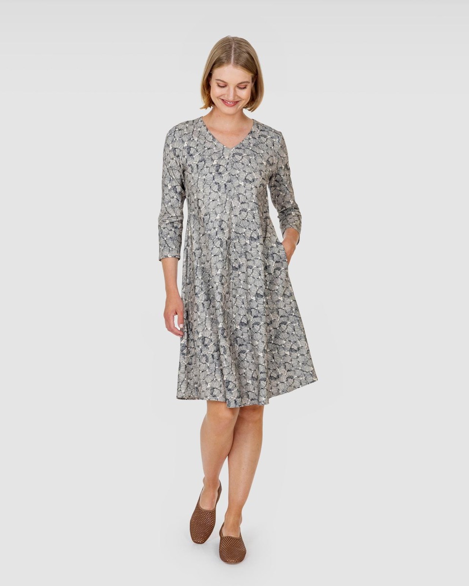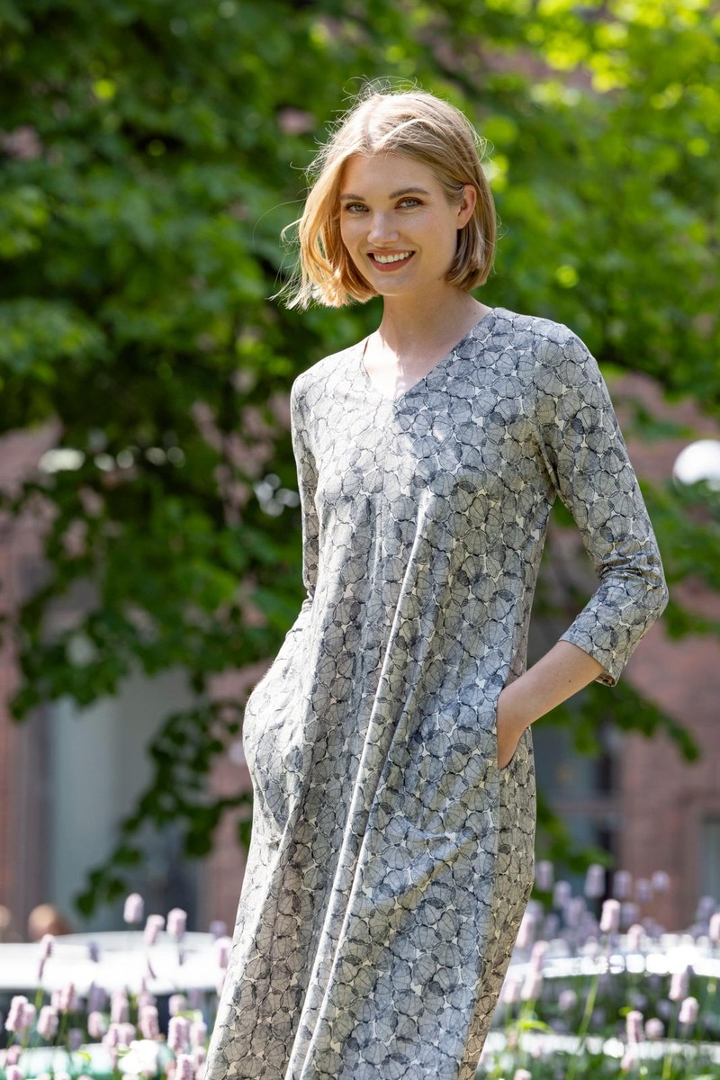 Naisellisen LOISKE-mekon materiaali on kauniisti laskeutuvaa kuosillista viskoositrikoota, jossa on hieman elastaania joustoa antamassa. Vaaleanbeigen mekon kuosina on tummansinisiä tyyliteltyjä simpukoita. Taskullinen mekko on hartioistaan siro, mutta se levenee helmaan. Materiaalin vinoleikkaus antaa tuotteelle kauniisti pukevan ja kellomaisen helman. Mekossa on V-pääntie ja kyynärpäiden yli ulottuvat hihat. LOISKE-mekko on suunniteltu Suomessa ja valmistettu Virossa. Malli on 177 cm pitkä ja hänellä on päällä S koko, jonka pituus on 100 cm ja rinnanympärys 94 cm.