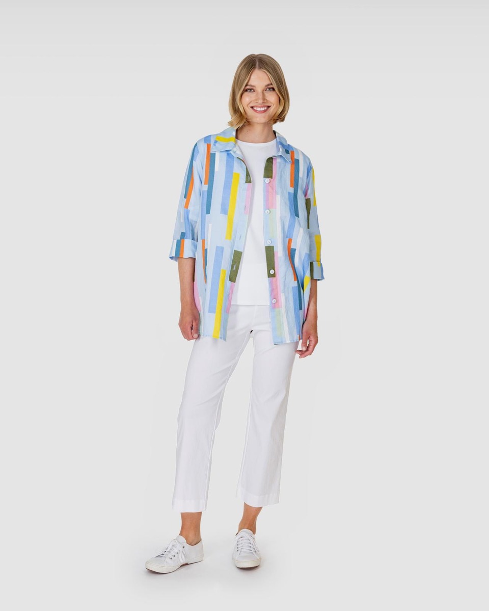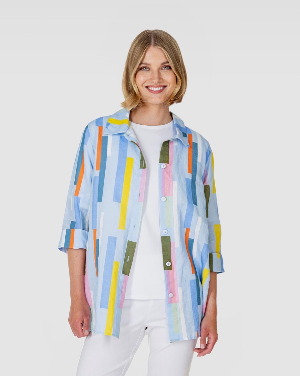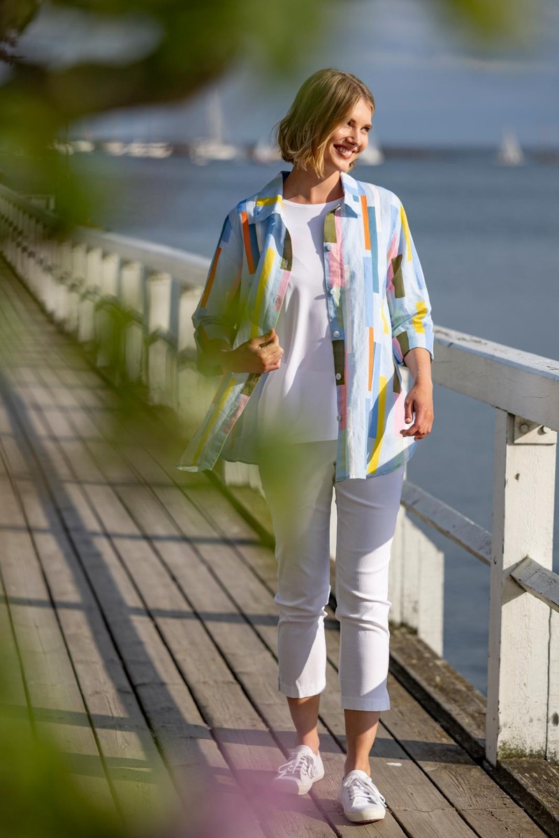 JENKKA-paita on valmistettu kauniisti laskeutuvasta painetusta pellava-puuvillakankaasta. Kuosissa on vaaleansinisellä pohjalla kaupunkimaiseman inspiroimia monivärisiä palkkeja. Vaatetta voi käyttää myös kevyenä jakkuna. Siinä on paitakaulus, nappikiinnitys ja pyöristetty helma. Kyynärpäiden yli ulottuvissa hihoissa on halkiot ja leveät käänteet, joiden avulla hihoja voi kääntää lyhyemmiksi. Paita on tuotepesty, joten se ei kutistu ja tuntuu miellyttävän pehmeältä päällä. JENKKA-paita on suunniteltu Suomessa ja valmistettu Liettuassa. Malli on 177 cm pitkä ja hänellä on päällä S koko, jonka pituus on 75 cm ja rinnanympärys 104 cm.