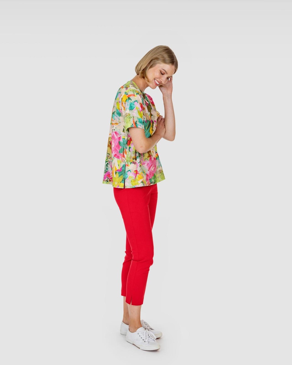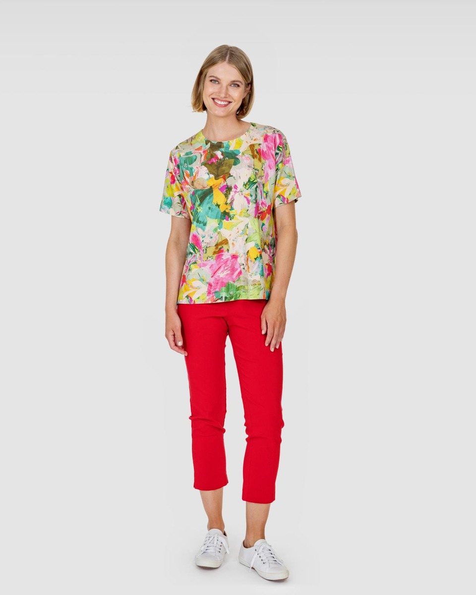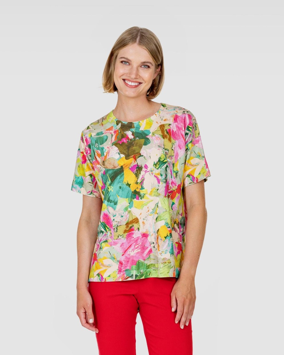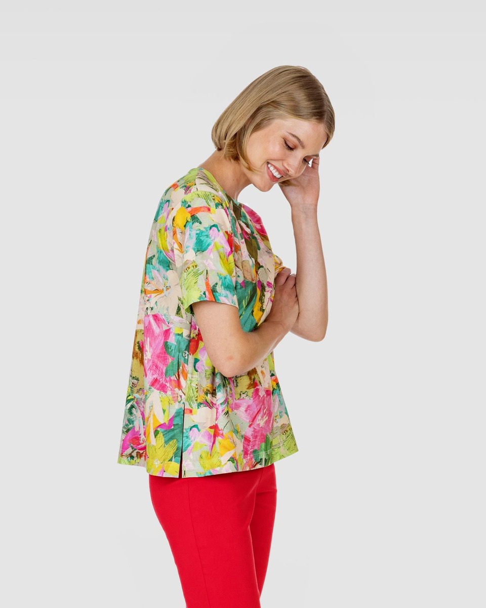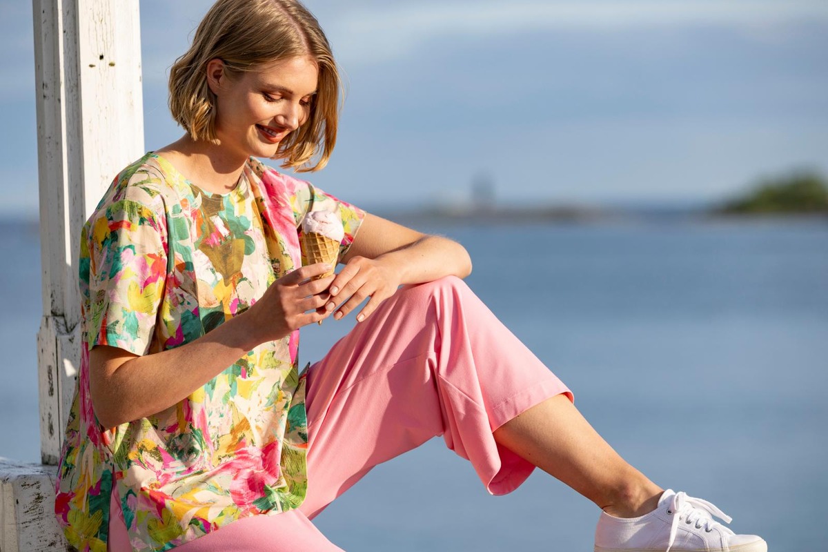 RATAMO-paita on laatikkomainen ja väljä. Paidassa on pyöreä pääntie, lyhyet hihat sekä halkiot sivusaumoissa. Kesäisen t-paidan kuosissa kukkivat värikkäät kukat. Materiaali on kauniisti laskeutuvaa, joustavaa ja helppohoitoista viskoositrikoota, jossa on hieman elastaania joustoa antamassa. RATAMO-paita on suunniteltu Suomessa ja valmistettu Virossa. Malli on 177 cm pitkä ja hänellä on päällä S-koko, jonka pituus on 64 cm ja rinnanympärys 108 cm.