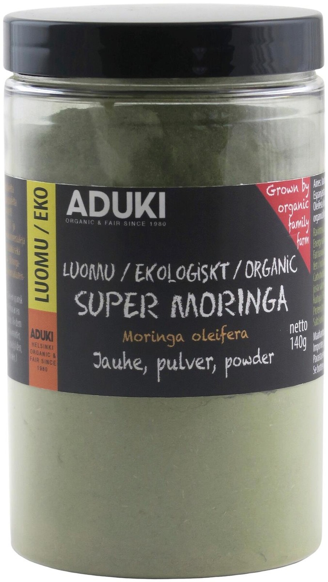 Adukin moringajauhe on valmistettu ainoastaan kasvin lehtiosista eikä siihen ole lisätty mitään ylimääräistä. Moringajauhetta voi käyttää juomissa, smootheissa, salaateissa ja ruoanlaitossa yleisesti. Vuoden 2024 Vuoden Superruoka.