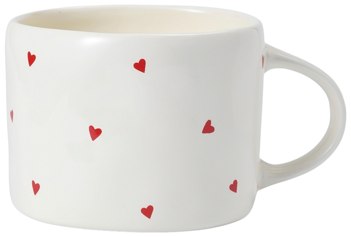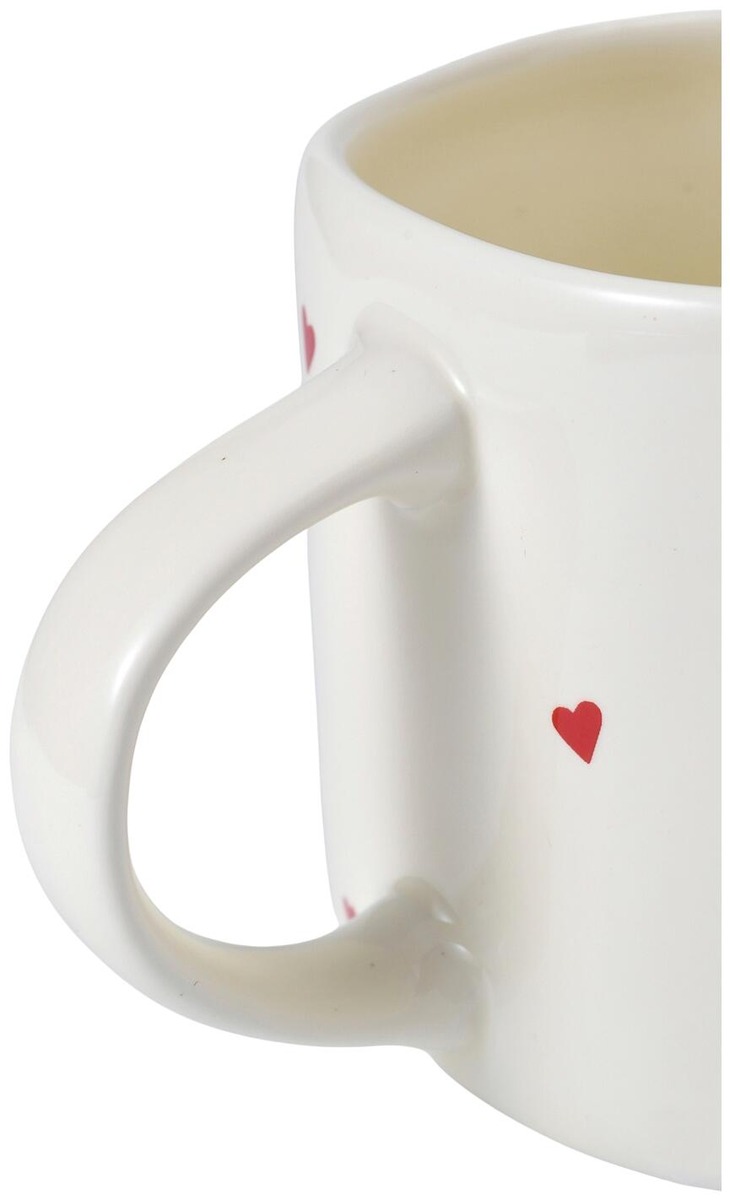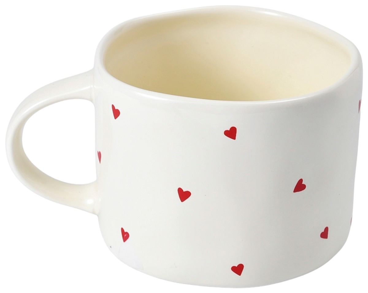 Rakasttettava muki pienillä sydämillä, täydellinen lahja rakkaallesi. Ystävänpäivämuki on valmistettu kivitavarasta ja siinä on suuri, pyöreä kahva.