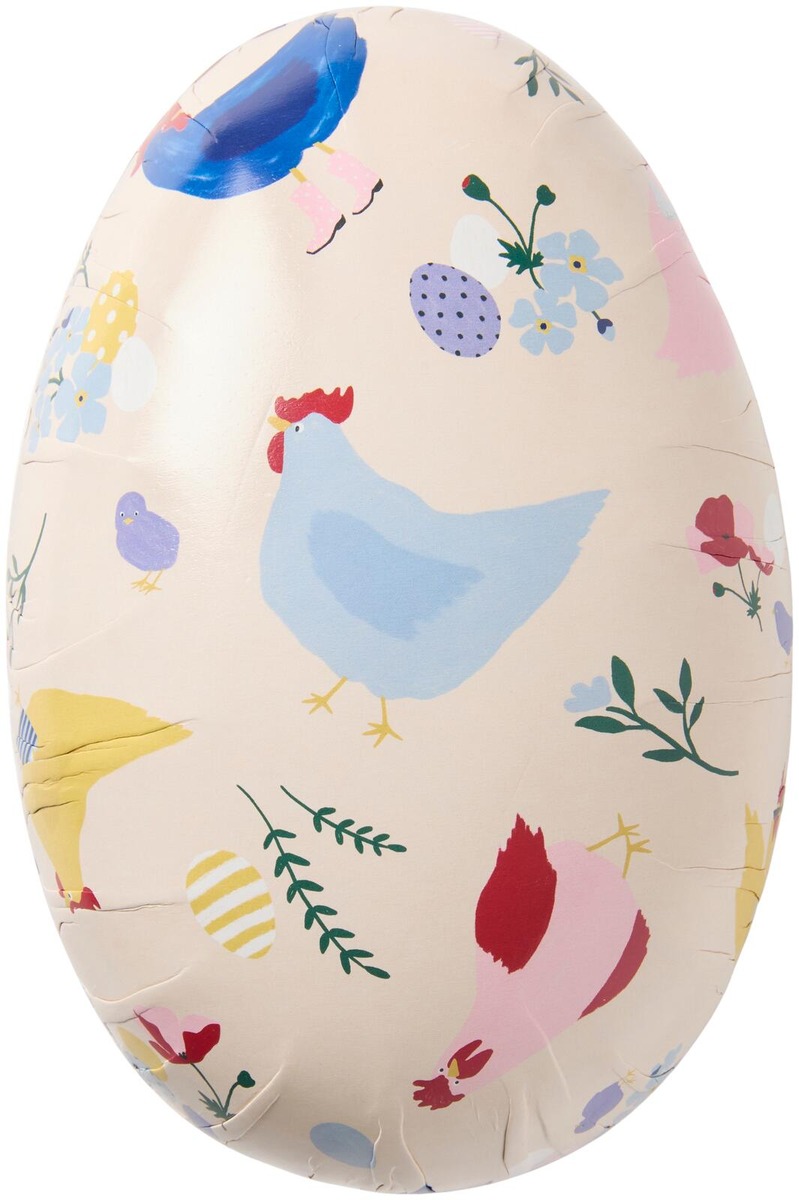 Pääsiäismuna, joka voidaan täyttää karkeilla tai lahjoilla. Kauniisti kuvioitu värikkäillä kanoilla. Muna on tehty paperista. Halkaisija: 23 cm