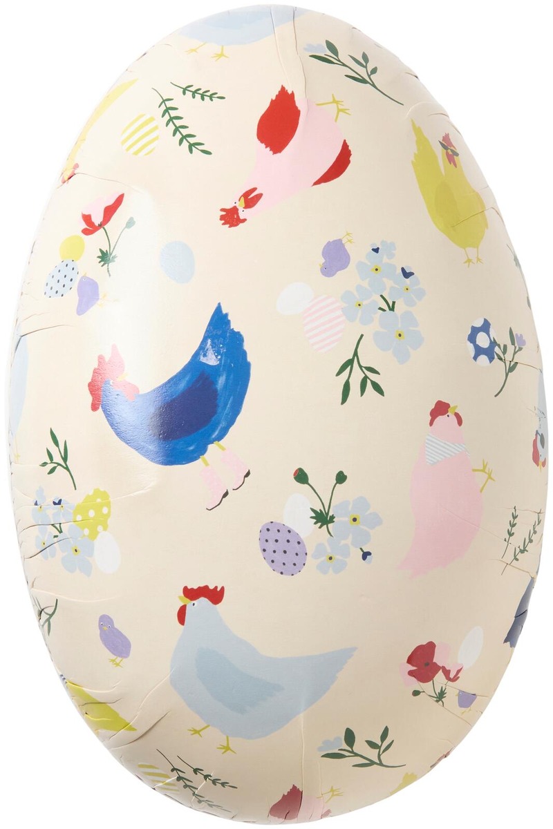 Suuri pääsiäismuna, joka voidaan täyttää karkeilla tai lahjoilla. Kauniisti kuvioitu värikkäillä kanoilla. Muna on tehty paperista. Halkaisija: 30 cm