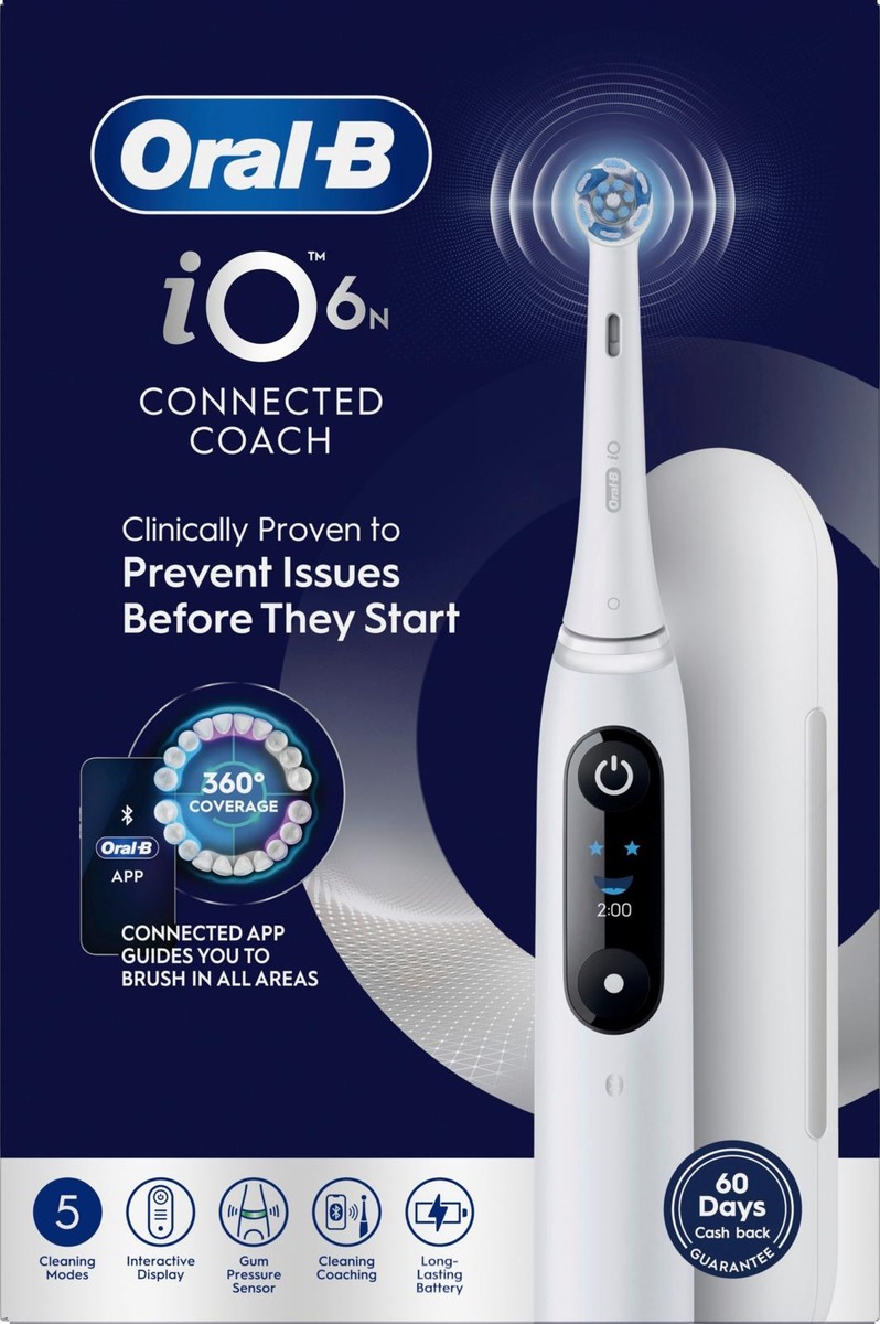 Oral-B iO 6 -sähköhammasharja käyttää Oral-B:n parasta puhdistusteknologiaa ja yhdistää ainutlaatuisen, hammaslääkärien innoittaman pyöreän harjaspään hellävaraiseen mikrovärähtelyyn antaen ammattimaisen puhtaan tunteen joka päivä. Kliinisesti todistettu teknologia. Suunniteltu ehkäisemään ongelmia ennen kuin ne alkavat. Lataa ORAL-B-sovellus, niin voit seurata aikaa ja harjausaluetta sekä varmistaa, ettei yksikään kohta jää harjaamatta. Synkronoi Apple Health -sovelluksen kanssa ja seuraa keskimääräistä harjausaikaasi joka päivä. Vaihda harjaspää 3 kuukauden välein parhaan puhdistustehon säilyttämiseksi.