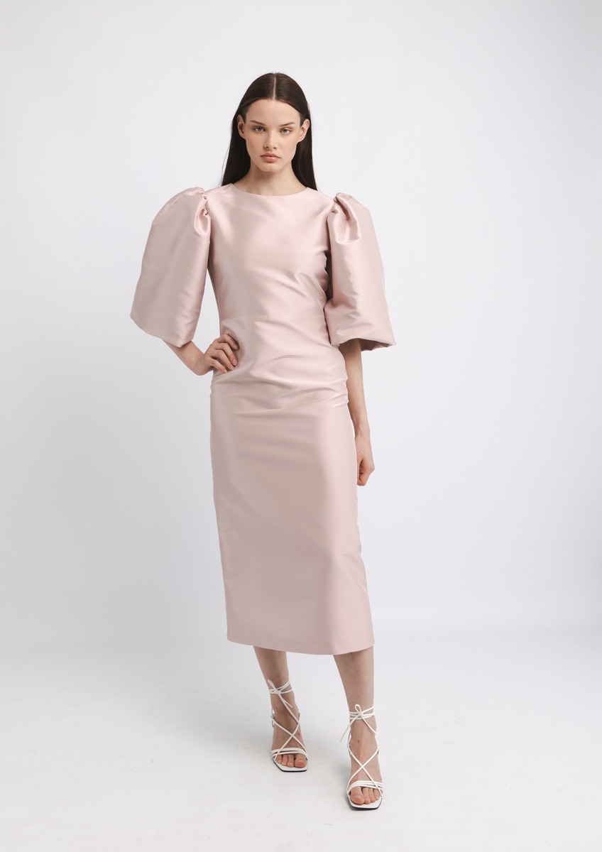 Tämä midi-mittainen mekko on valmistettu ryhdikkäästä mikadosatiinikankaasta, joka antaa sille juhlavan ja näyttävän olemuksen. Tyköistuva malli korostaa kauniisti vartalon linjoja, kun taas suuret 2/4-mittaiset puhvihihat tuovat asuun eleganttia näyttävyyttä. Selässä kulkeva pitkä vetoketju tekee pukemisesta helppoa ja viimeistelee ilmeen siististi. Mekko on vuoritettu, mikä takaa miellyttävän istuvuuden ja huolitellun siluetin. Täydellinen valinta esimerkiksi häävieraalle. Suunniteltu Suomessa, valmistettu Virossa.
