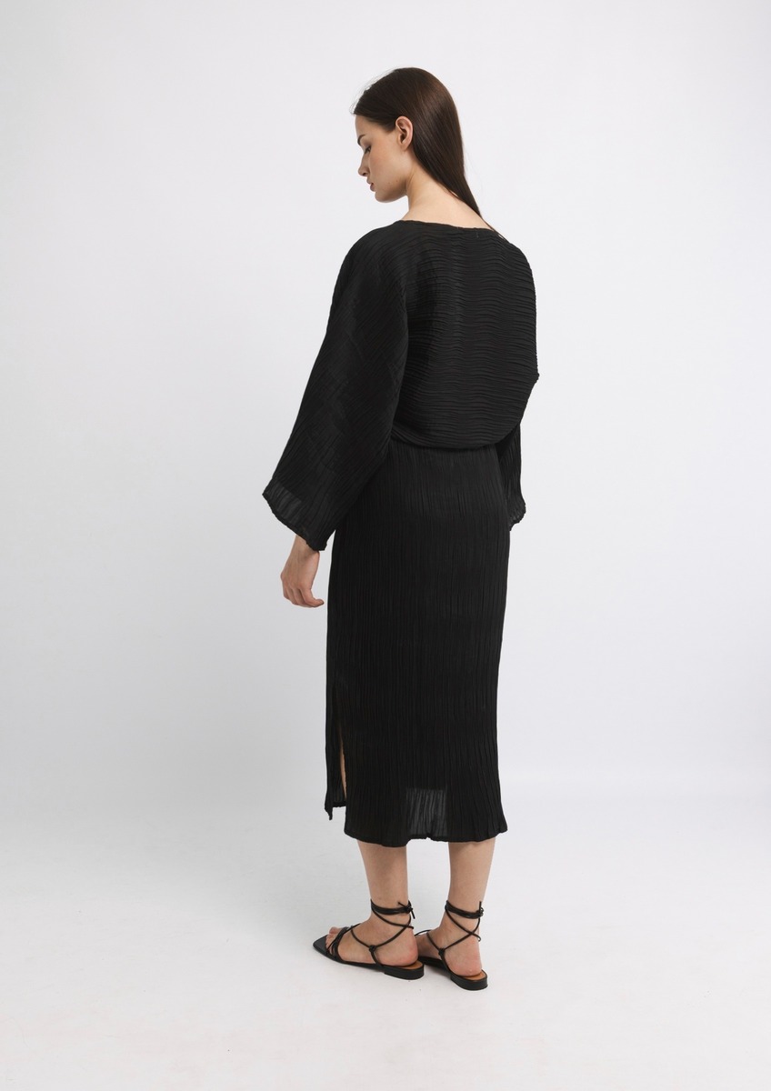 Tämä midimittainen mekko on valmistettu kauniisti pliseeratusta kankaasta, joka laskeutuu elegantisti ja luo ilmavan siluetin. Vuoriton malli tekee mekosta erityisen kevyen ja miellyttävän käyttää. Väljät pitkät hihat lisäävät mukavuutta ja tuovat asuun kepeää tyylikkyyttä. Helmassa sivulla oleva halkio luo kaunista liikettä. Vyötäröllä oleva kuminauha antaa mekolle muotoa ja imartelee vartaloa. Tämä veistoksellinen mekko on täydellinen yhdistelmä tyylikkyyttä ja käyttömukavuutta. Suunniteltu Suomessa, valmistettu Virossa.