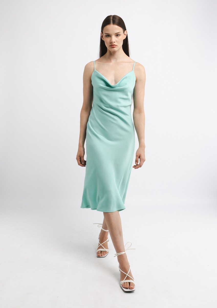 Tämä satiinimekko on yksinkertaisen tyylikäs ja vartalonmyötäinen valinta, joka korostaa kauniisti naisellista siluettia. Mekossa on naruolkaimet ja edessä elegantti vesiputouspääntie, joka tuo asuun keveyttä ja naisellista ilmettä. Midimittainen helma tekee mekosta monikäyttöisen, sopien sekä juhlaan että tyylikkääseen arkipukeutumiseen. Suunniteltu Suomessa, valmistettu Virossa.