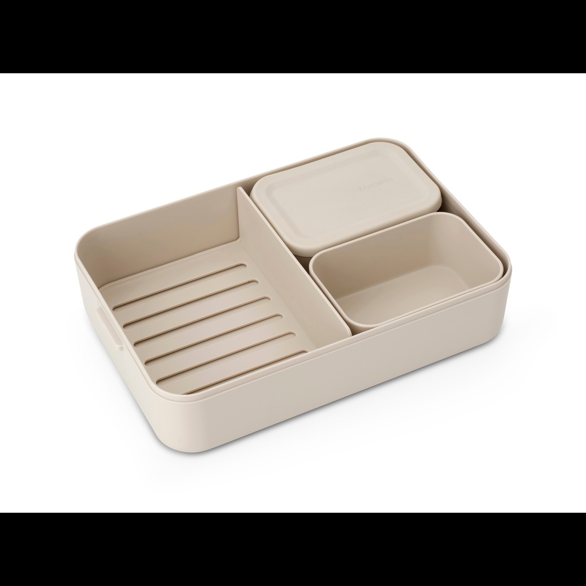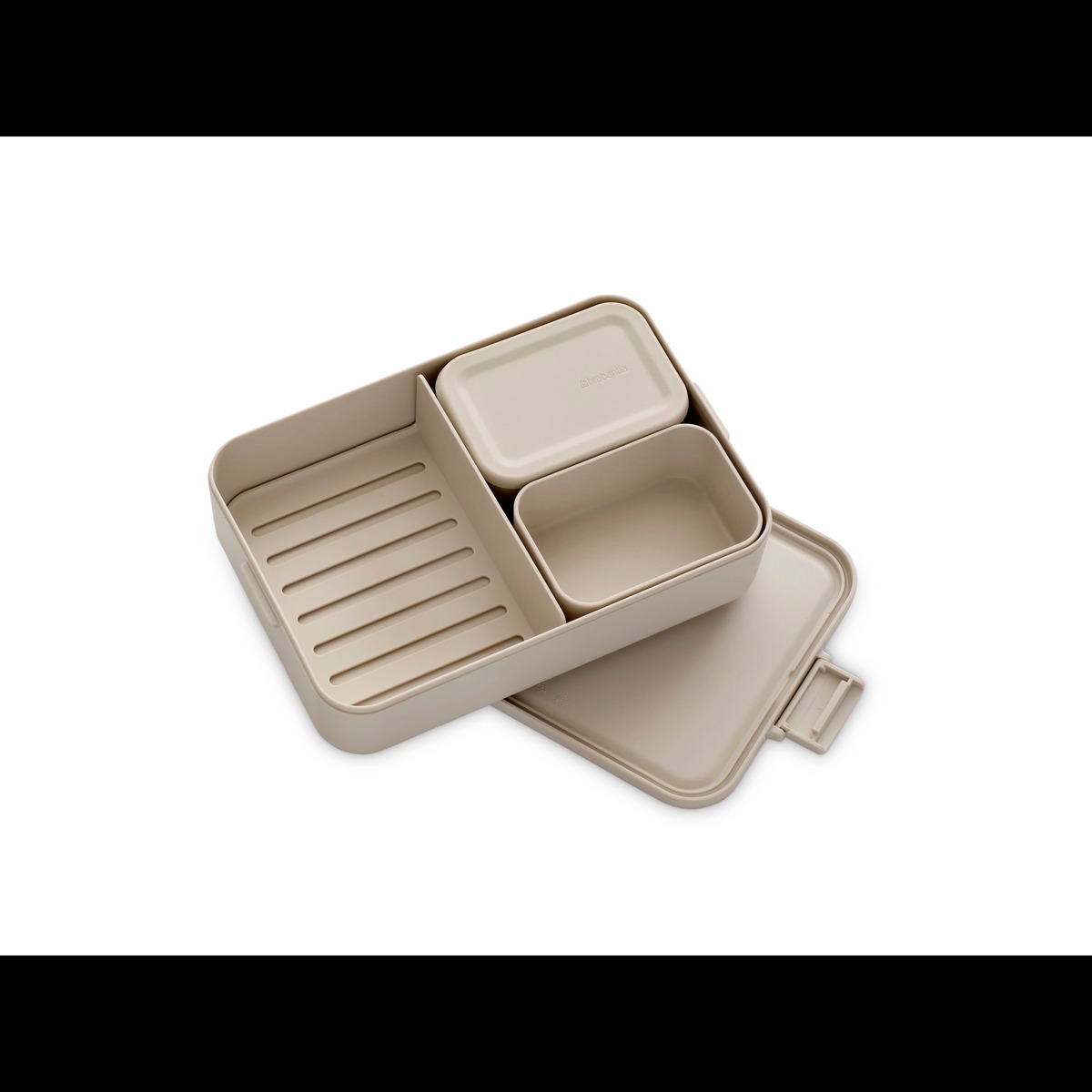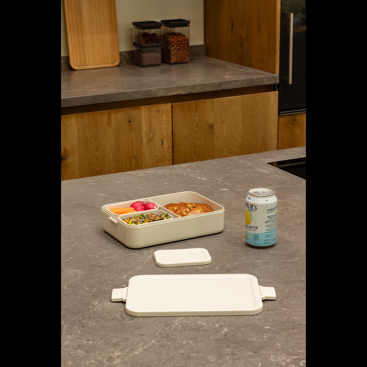 Kaipaatko vaihtelua? Sano ei kertakäyttöisille muoveille ja vaihda uudelleenkäytettäviin lounaspakkauksiin tällä Brabantian Make & Take isolla Bento eväsrasialla. Pakkaa voileipäsi, rullasi tai sämpyläsi helposti tai lisää kaksi erillistä rasia hedelmille, pähkinöille tai vihanneksille. Sinun lounas, sinun valinta. Nauti!