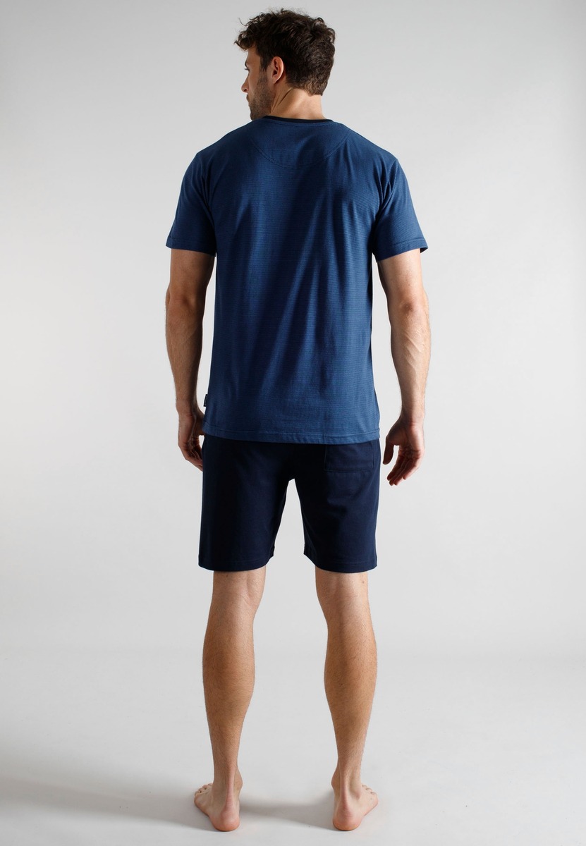 Miesten O-aukkoinen shortsipyjama joustavaa puuvillaneulosta. Kauniisti viimeistelty pääntie, housuissa joustava vyötärö.