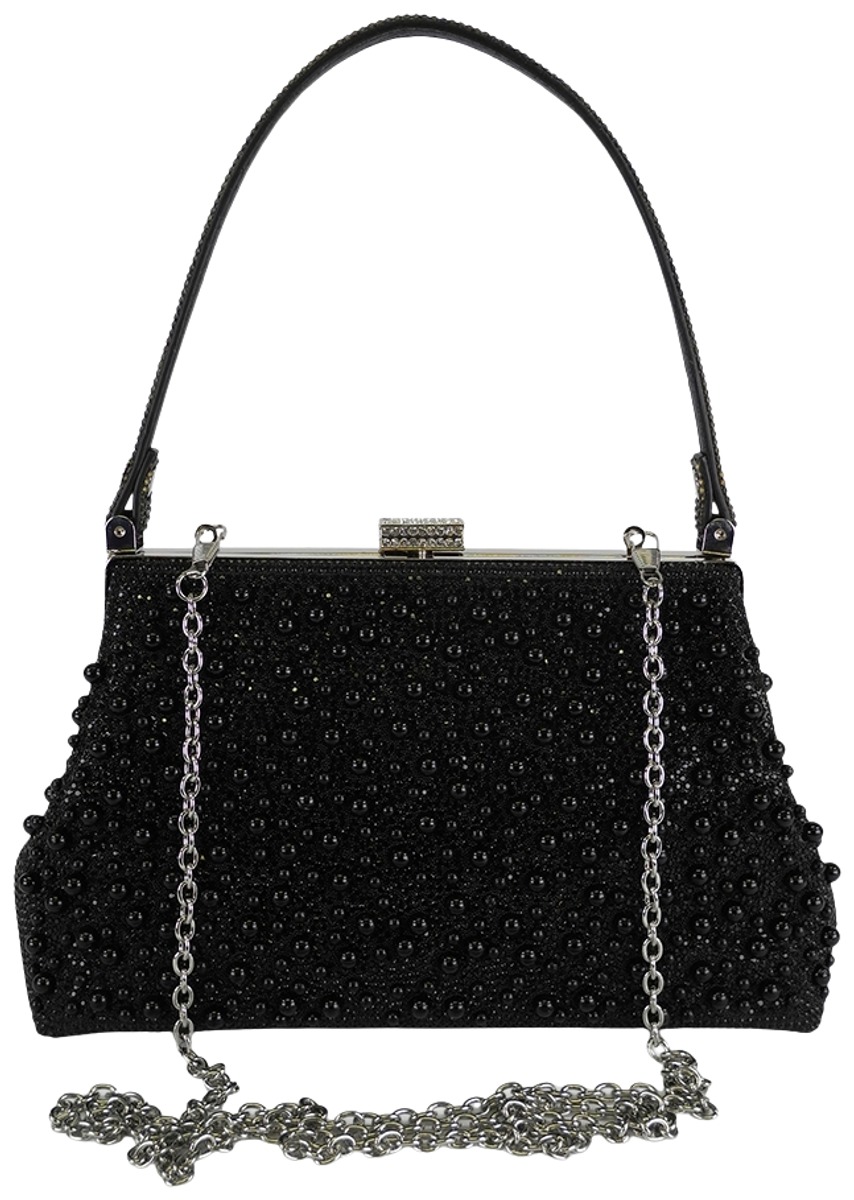 Lyhyt olkakahihna ja pitkä ketjuolkahihna. Kehys yläosassa. Helmikoristeita.