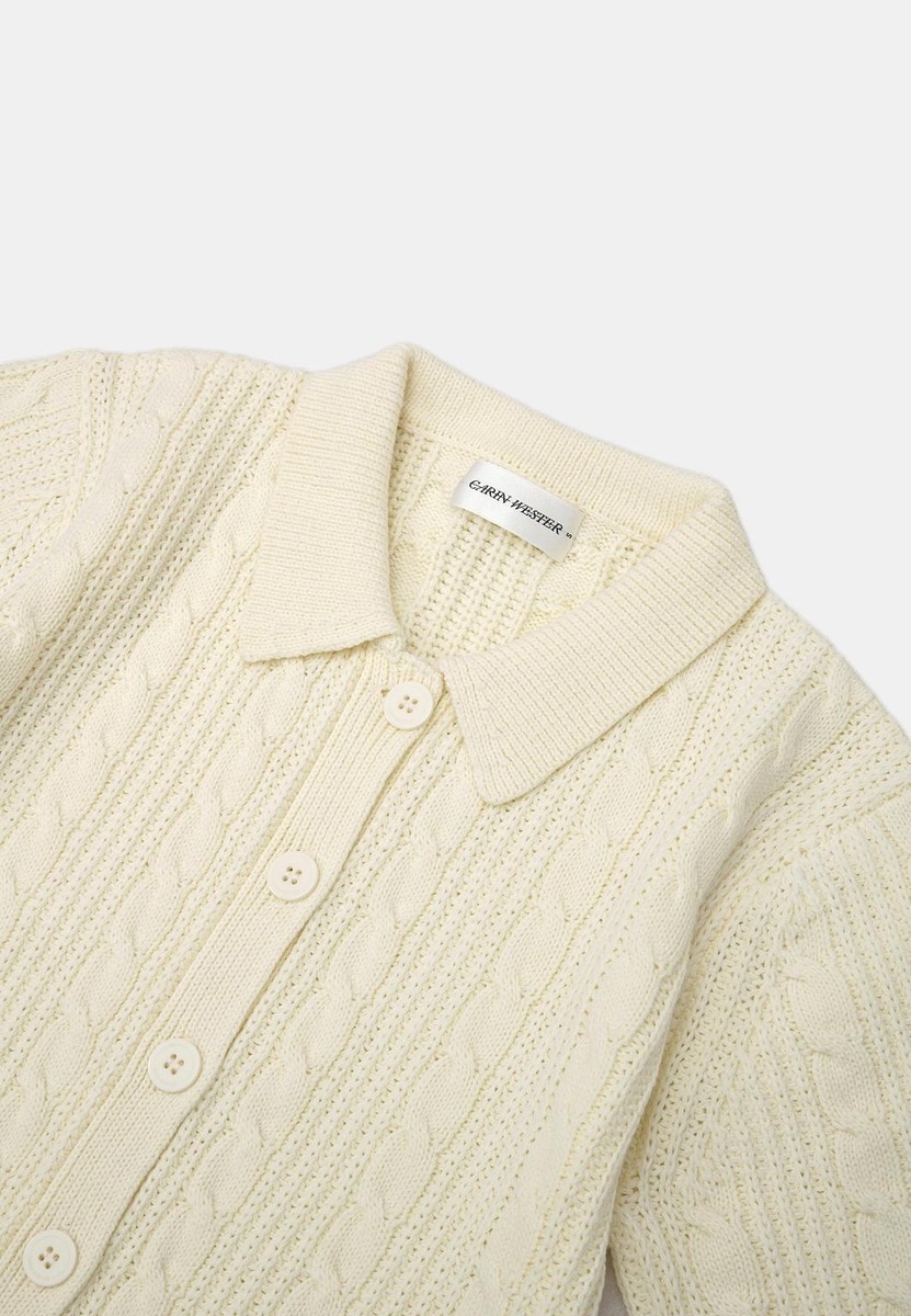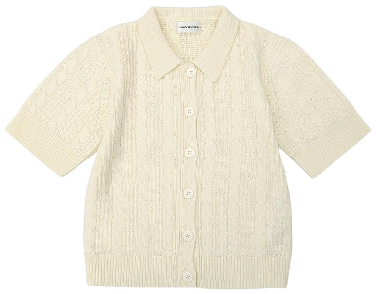 Carin Wester EJDA ?neuletakki on lyhythihainen, palmikkoneulottu malli puuvilla?akryylisekoitteesta. Kaulus ja sävyyn sointuva nappikiinnitys tuovat viimeistellyn ilmeen, ja hihansuissa sekä helmassa on leveät ribbiresorit – helppo kerrostaa arjen asuihin.