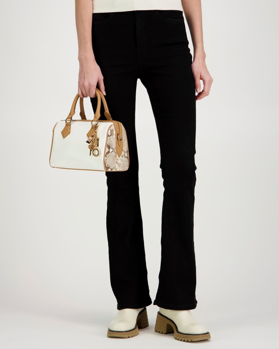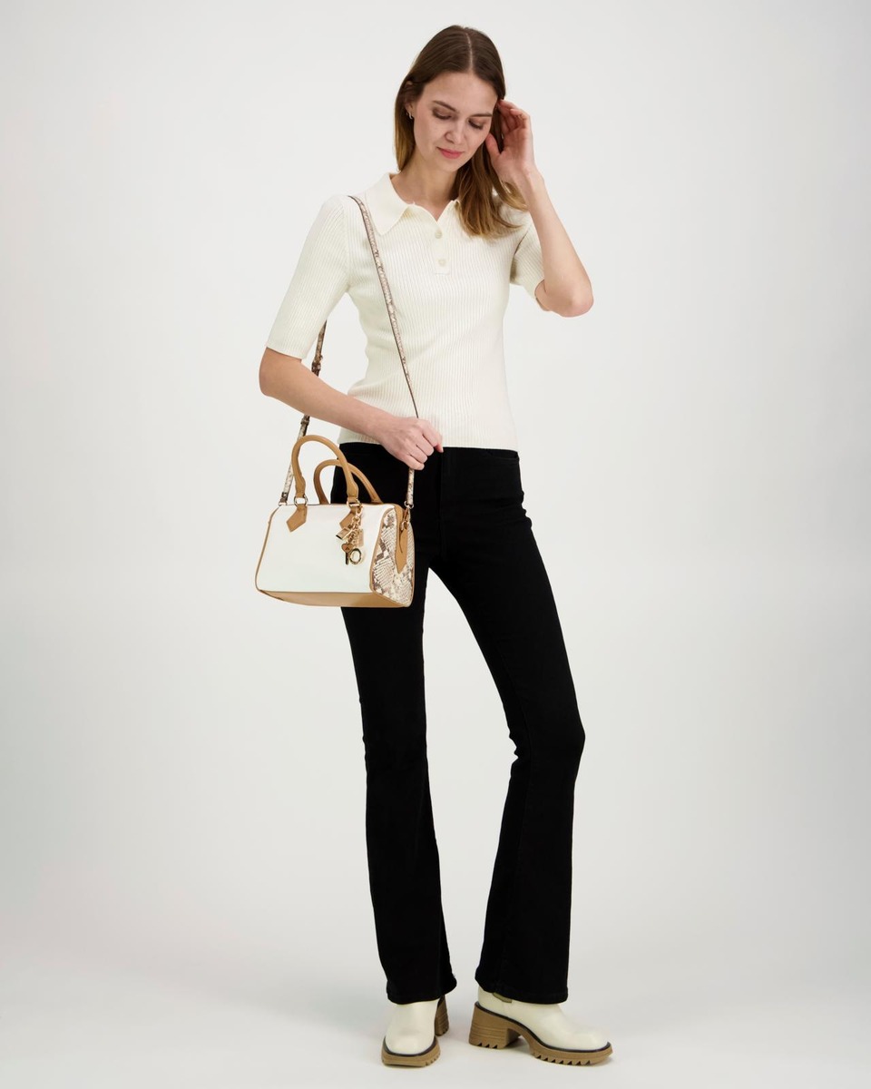 Vaalean beigen käsilaukun runko on edestä ja takaa vaalea beige. Sivuosat käärmekuvioitua keinonahkaa. Kahvat ja irrotettava olkahihan ovat vaalean ruskeat. Suljetaan vetoketjulla. Irrotettava laukkukoru.