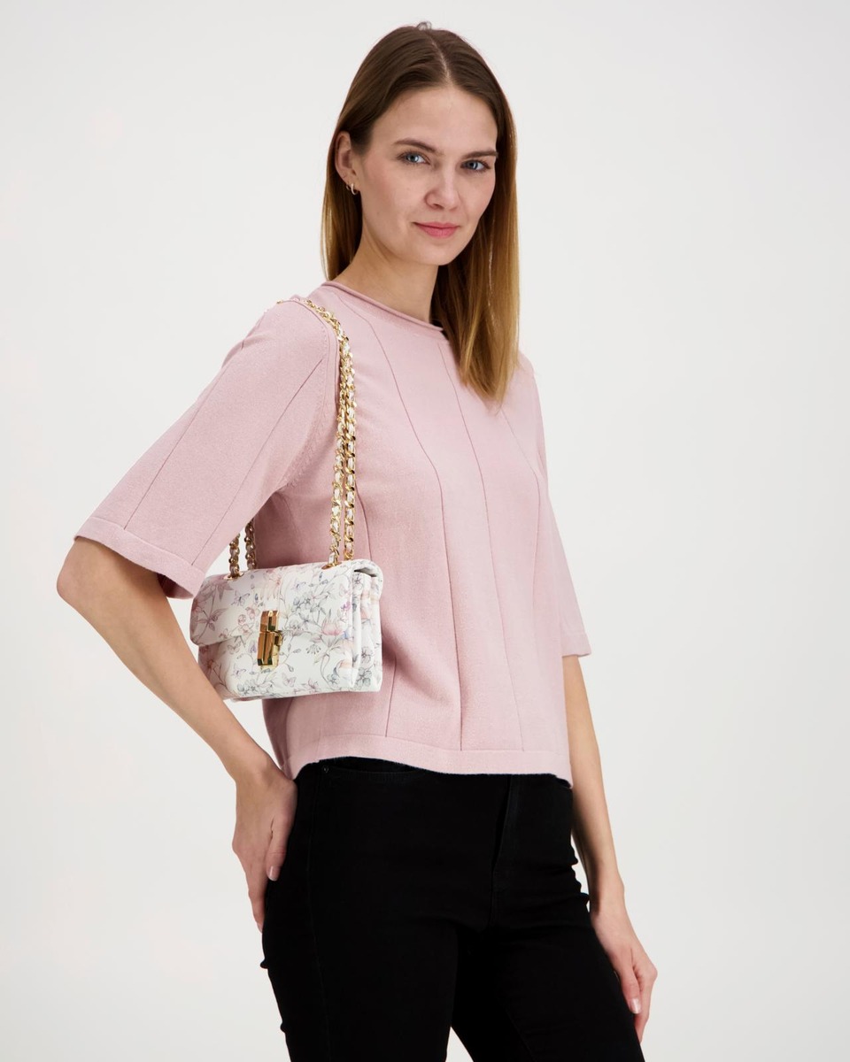 Ketjukoristeista olkahihnaa voi käyttää pitkänä tai kaksinkerroin. Laukun pinnassa kaunis kukkaprintti.