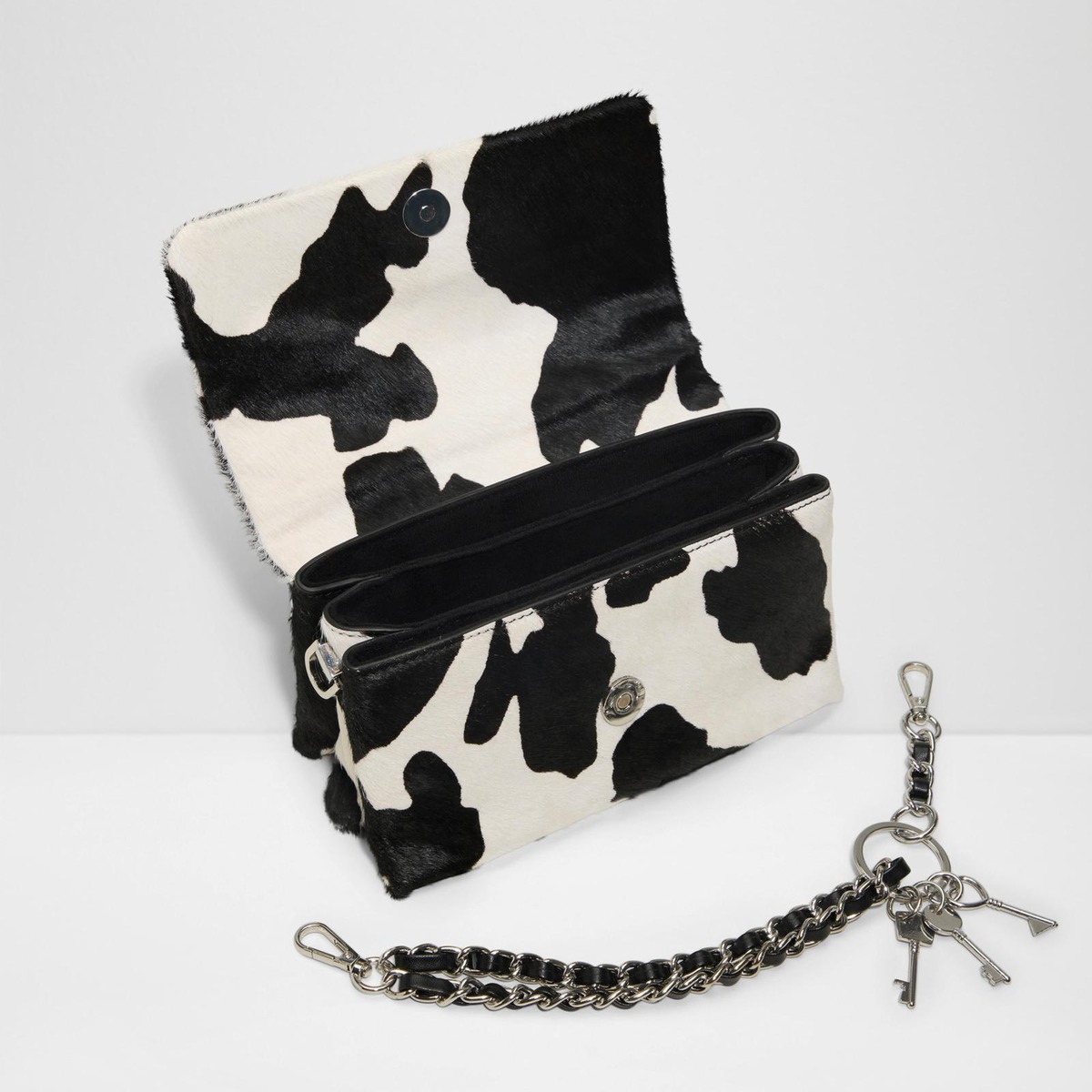 Muodikas lehmännahkainen olkalaukku. Irrotettava lyhyt ketjukoristeinen olkahihna ja pitkä säädettävä olkahihna.