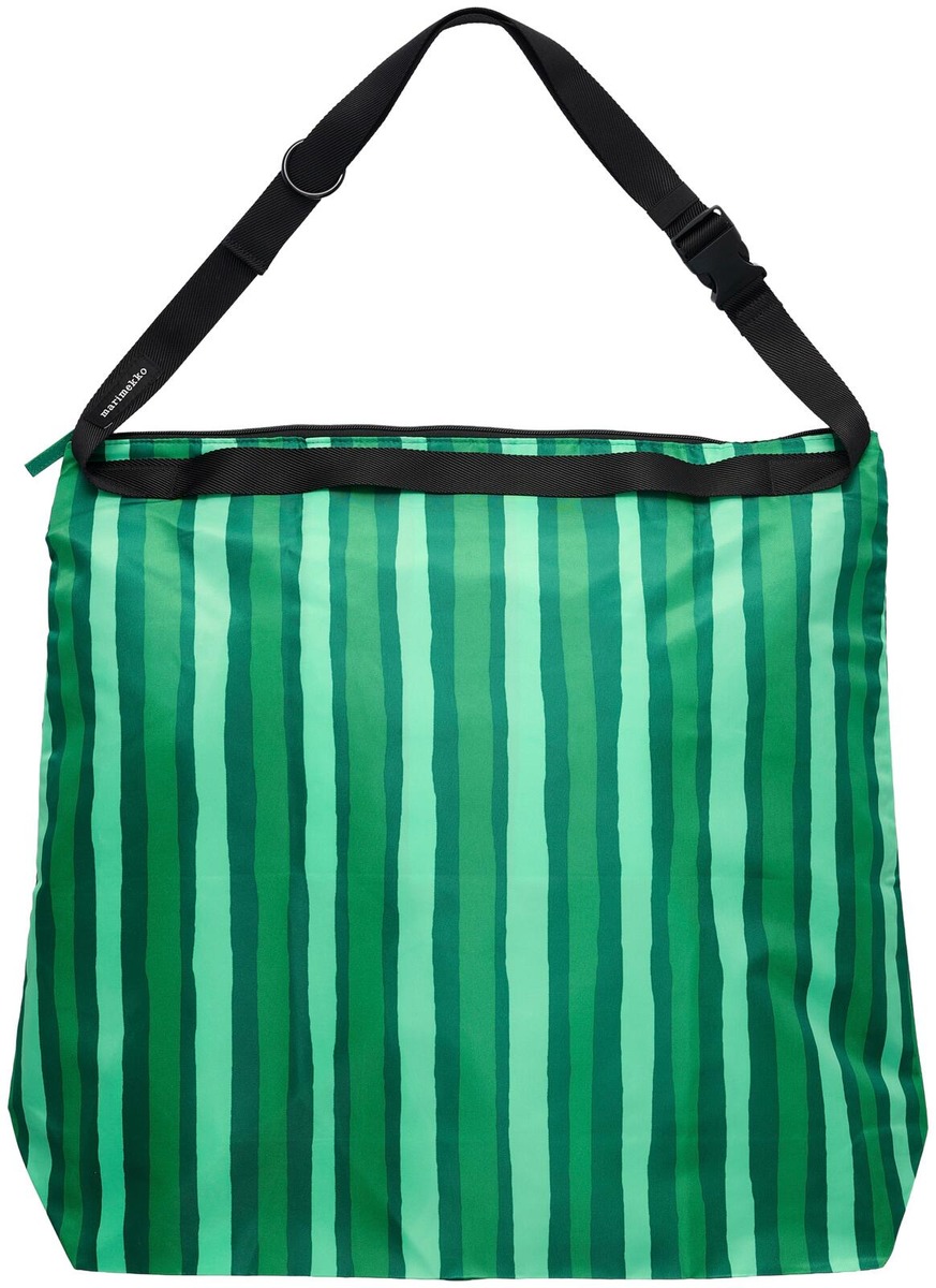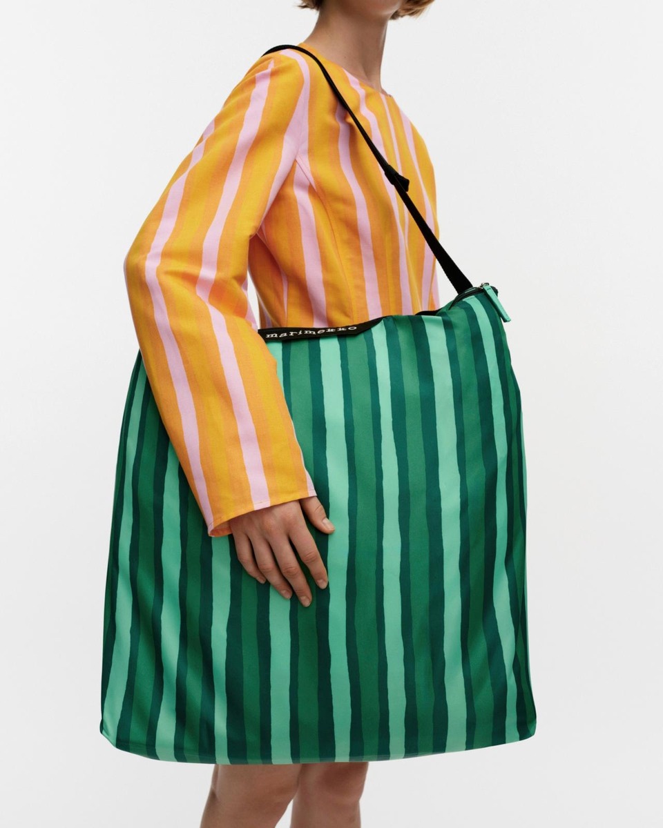 Piccolo-kuosinen Neat Crossbody L -olkalaukussa on säädettävä olkahihna. Laukku sulkeutuu vetoketjulla, ja siinä on Marimekko-tuotemerkkilappu edessä. Sisäpuolella on pieni avoin tasku, johon koko laukun voi taitella säilytystä varten. Tuotteen päämateriaali on 100 % kierrätettyä polyesteria ja olkahihna 100 % kierrätettyä polyamidia. Heti ensimmäisenä Marimekko-vuotenaan 1953 Vuokko Eskolin-Nurmesniemi loi Piccolon, vapain siveltimenvedoin maalatun raitakankaan. Kolme vuotta myöhemmin kauppoihin ja katukuvaan ilmestyi – ilmeisesti pysyvästi – kankaasta tehty paita nimeltään Jokapoika.