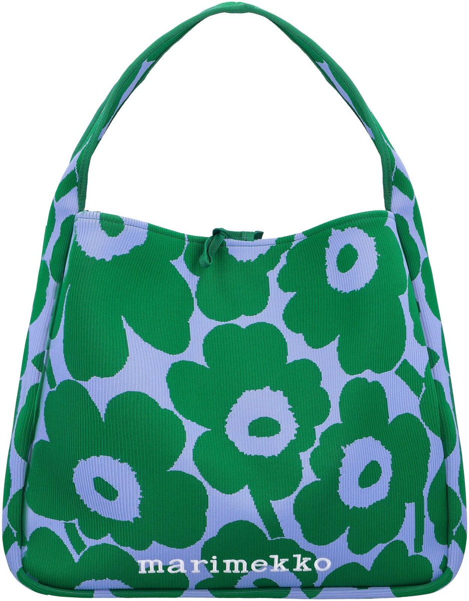 Knitted Bag Large -olkalaukussa on jacquard-kudottu Unikko-kuosi. Ryhdikkäässä laukussa on raidallinen pinta. Isossa laukussa on leveä olkahihna, se sulkeutuu sidottavilla nauhoilla, ja siihen on brodeerattu Marimekko-logo etupuolelle. Tuote on valmistettu 100-prosenttisesta kierrätetystä polyesterista. Luovuutta ja rohkeutta symboloiva Unikko syntyi aikana, jolloin Marimekon kuviomaailmaan ei juuri kuulunut kukkia. Maija Isolaa kukka-aihe kuitenkin kiinnosti, ja hän päätti suunnitella kokonaisen sarjan uudenlaisia vahvoja kukkakuoseja.