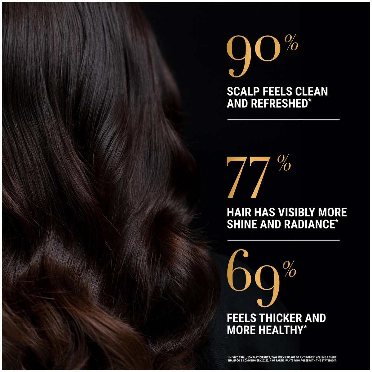 Antipodesin ennätyksellisessä in vivo -kuluttajatutkimuksessa yli 600 osallistujan joukosta 156 henkilöä käytti Manuka + Orange Volume & Shine -shampoota ja -hoitoainetta. Jo kahden viikon käytön jälkeen: