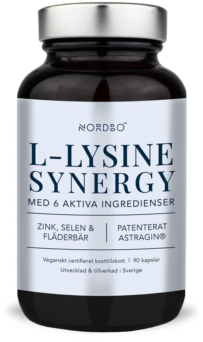 Nordbo L-Lysine Synergy on synerginen kompleksi, joka sisältää välttämätöntä aminohappoa L-lysiiniä yhdessä sinkin, seleenin, mustaseljan, B6-vitamiinin ja AstraGin®-uutteen kanssa.