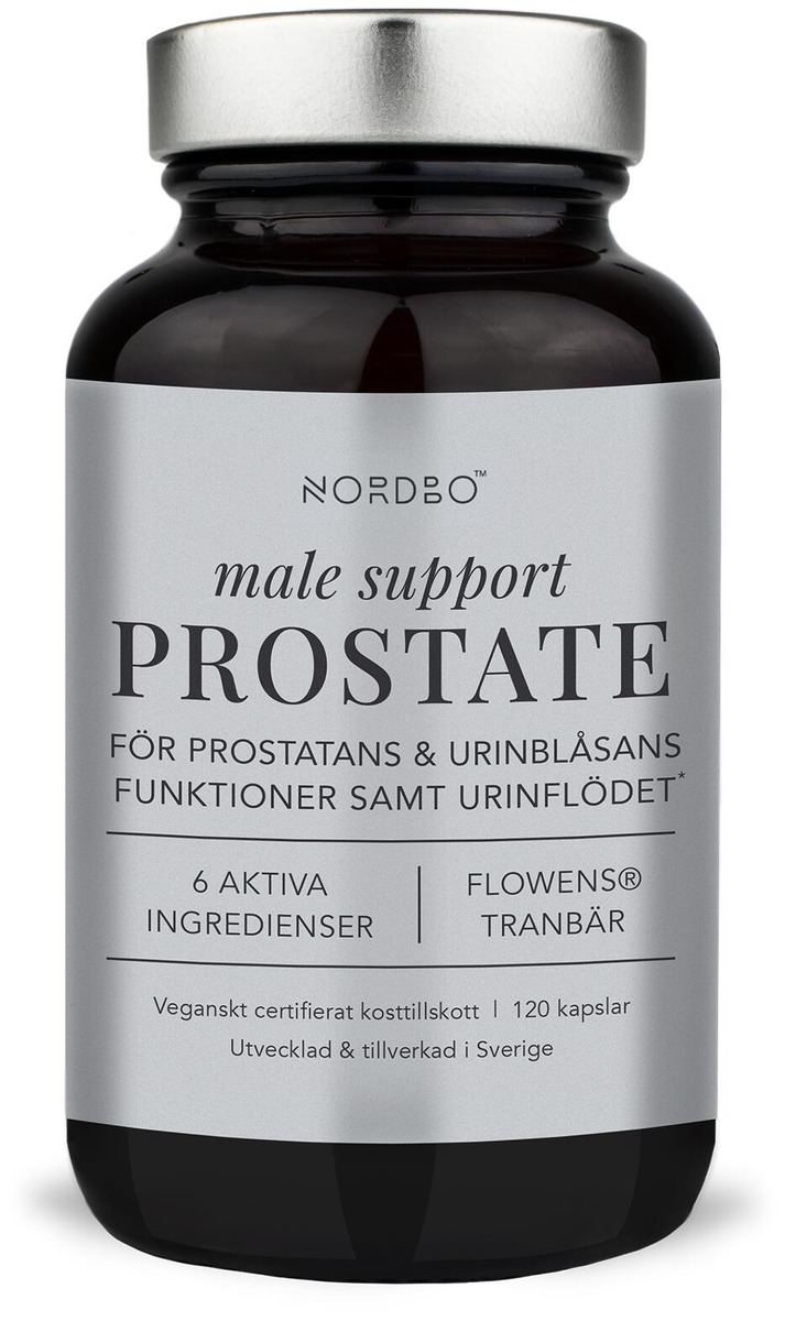Nordbo Male Support Prostate on kehitetty miesten eturauhasen, virtsateiden ja virtsarakon hyvinvoinnin tueksi. Tuote sisältää 6 aktiivista ainesosaa: Flowens®-karpalouutteen, kurpitsansiemeniä, granaattiomenaa, nokkosta, sinkkiä ja seleeniä.