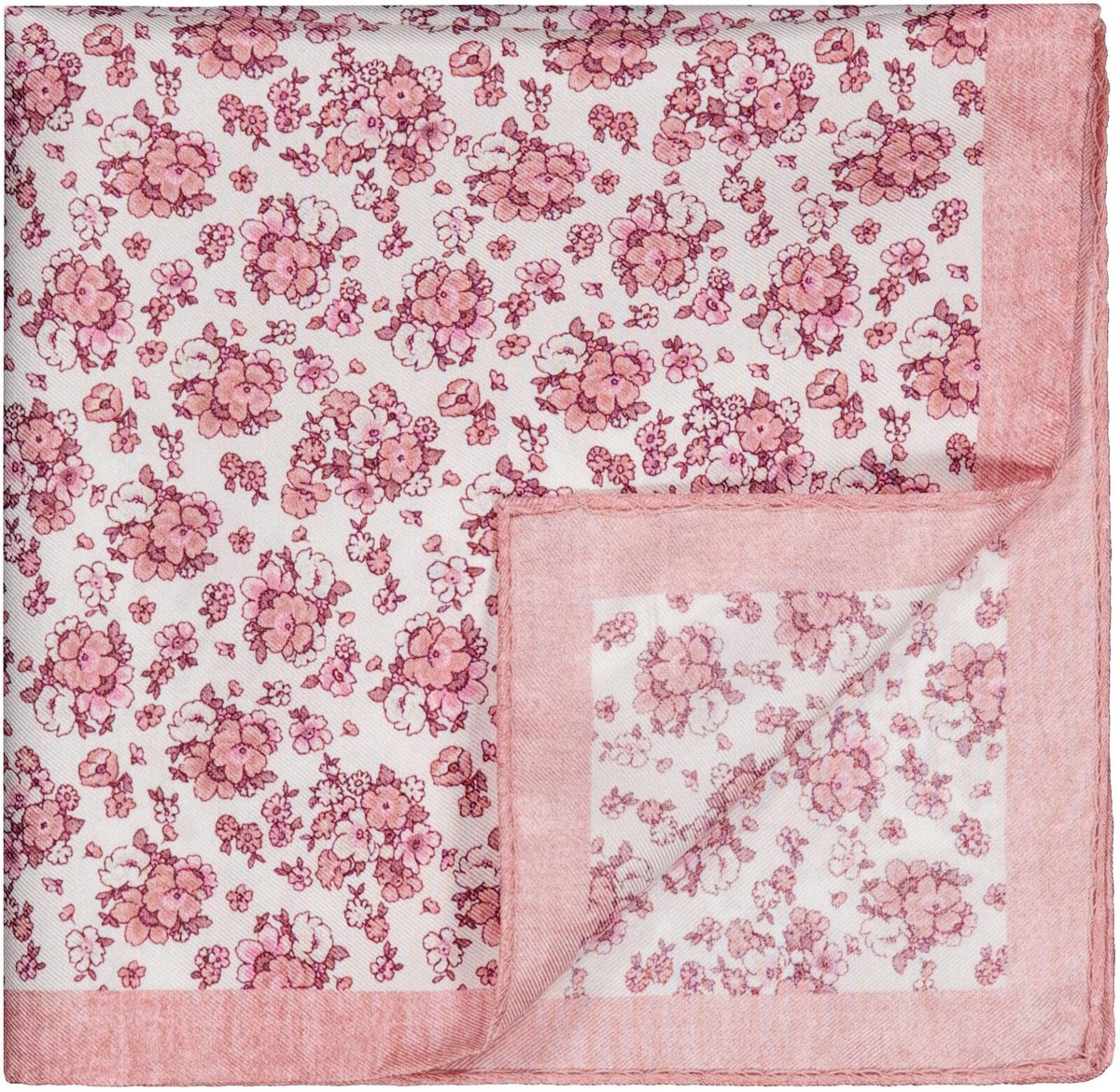 Klassinen 33 x 33 cm painettu taskuliina kukkakuviolla ja yksivärisellä reunuksella, valmistettu 100 % silkkitvillistä. Elegantti ja laadukas asuste viimeistelemään juhla‑ ja arkipukeutumisen.