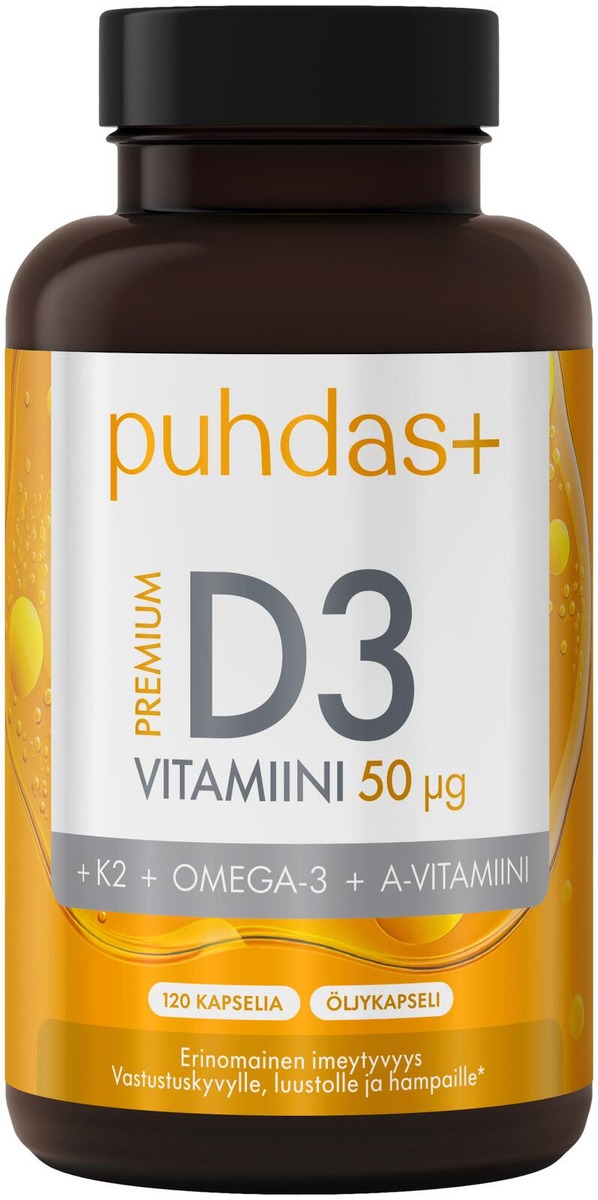 Puhdas+ Premium D3-vitamiini on monipuolinen ja helposti imeytyvä vitamiinivalmiste, joka yhdistää D3-, K2- ja A-vitamiinit sekä omega-3-rasvahapot samaan kapseliin. Täydellinen valinta, kun haluat tukea kehosi hyvinvointia yksinkertaisesti ja tehokkaasti. D3-vitamiini edistää immuunijärjestelmän normaalia toimintaa sekä luuston ja hampaiden pysymistä normaaleina ja tukee kalsiumin normaalia imeytymistä. K2-vitamiini edistää veren normaalia hyytymistä ja A-vitamiini auttaa ylläpitämään normaalia näkökykyä.