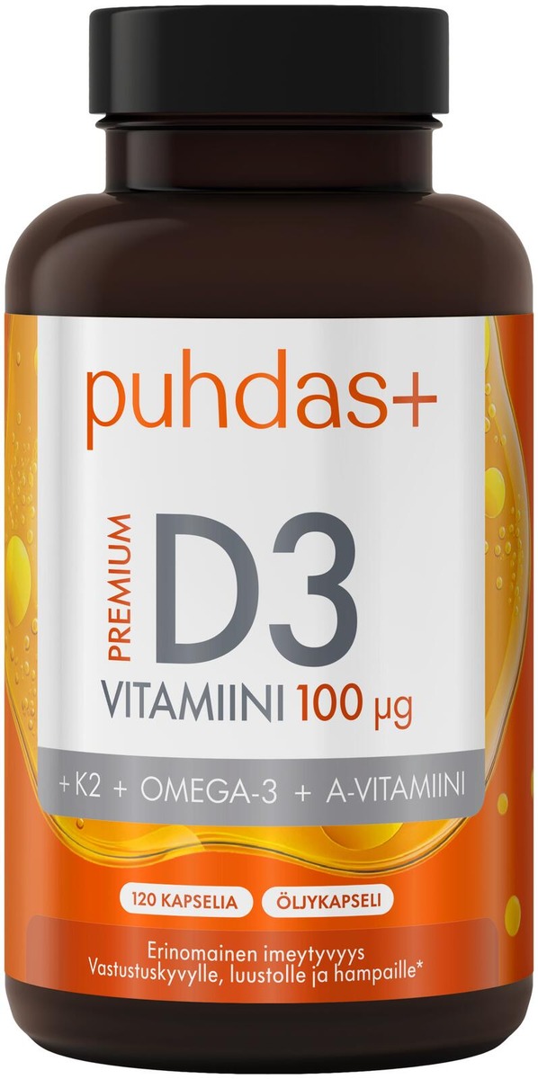 Puhdas+ Premium D3-vitamiini on monipuolinen ja helposti imeytyvä vitamiinivalmiste, joka yhdistää D3-, K2- ja A-vitamiinit sekä omega-3-rasvahapot samaan kapseliin. Täydellinen valinta, kun haluat tukea kehosi hyvinvointia yksinkertaisesti ja tehokkaasti. D3-vitamiini edistää immuunijärjestelmän normaalia toimintaa sekä luuston ja hampaiden pysymistä normaaleina ja tukee kalsiumin normaalia imeytymistä. K2-vitamiini edistää veren normaalia hyytymistä ja A-vitamiini auttaa ylläpitämään normaalia näkökykyä.