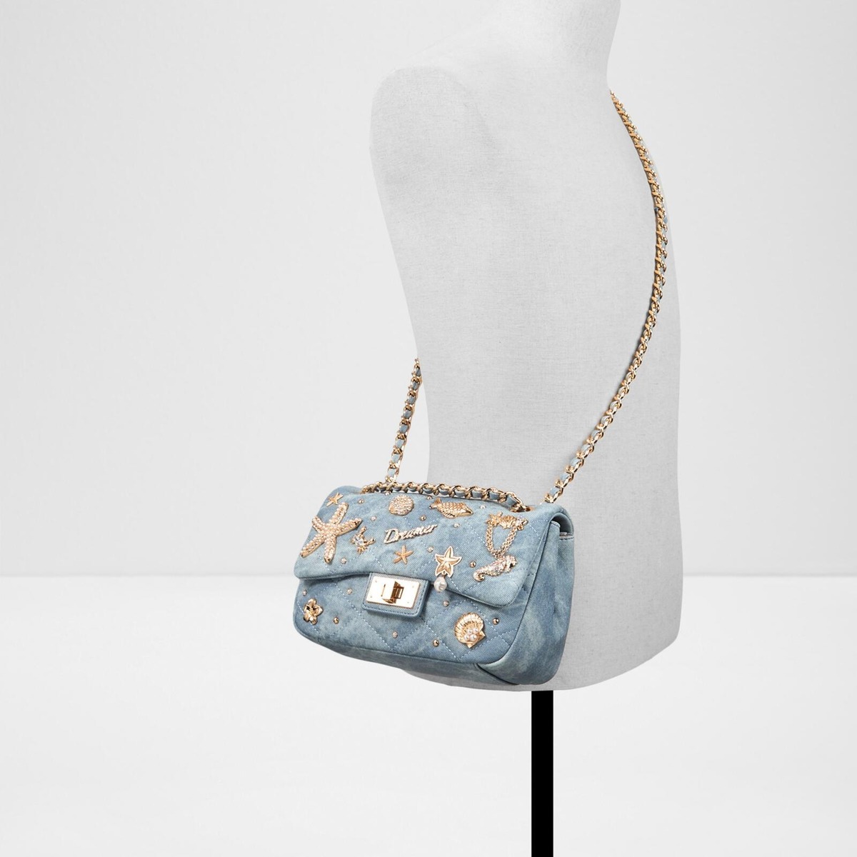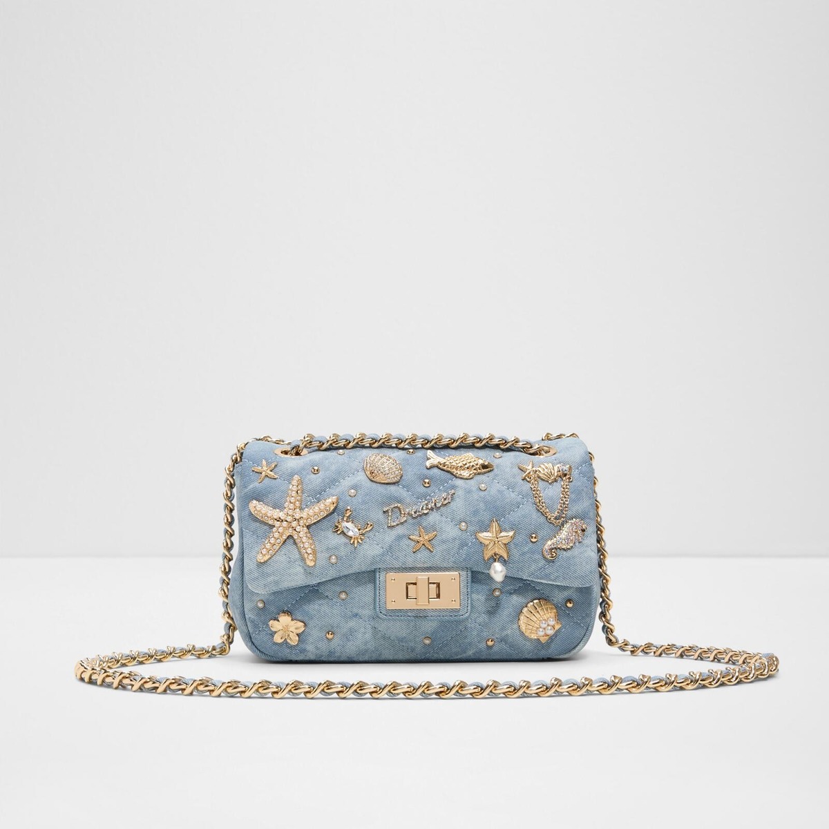 Laukun pinta koristeltu metallisilla merieläinaiheisilla kuvioilla. Ketjuolkahihnaa voi käyttää pitkänä tai kaksinkerroin. Läppä suljetaan soljella.