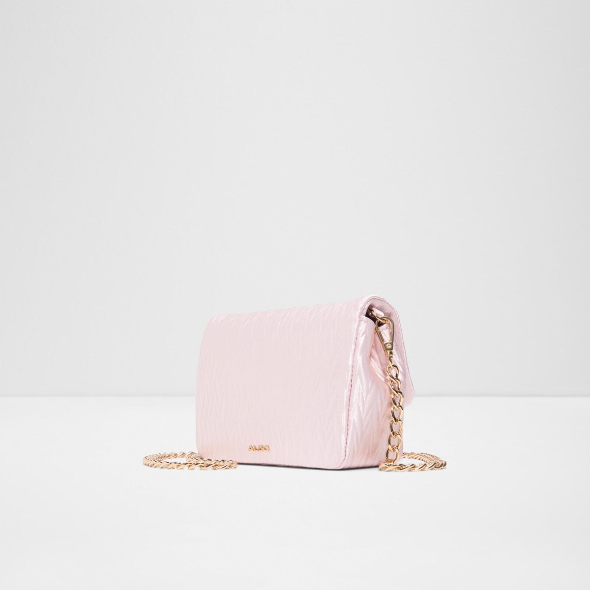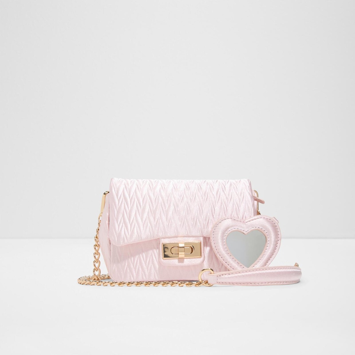 Tikkauskoristeinen satiinipintainen pikkulaukku. Irrotettava sydän laukkukoru ja ketjukoristeinen olkahihna.