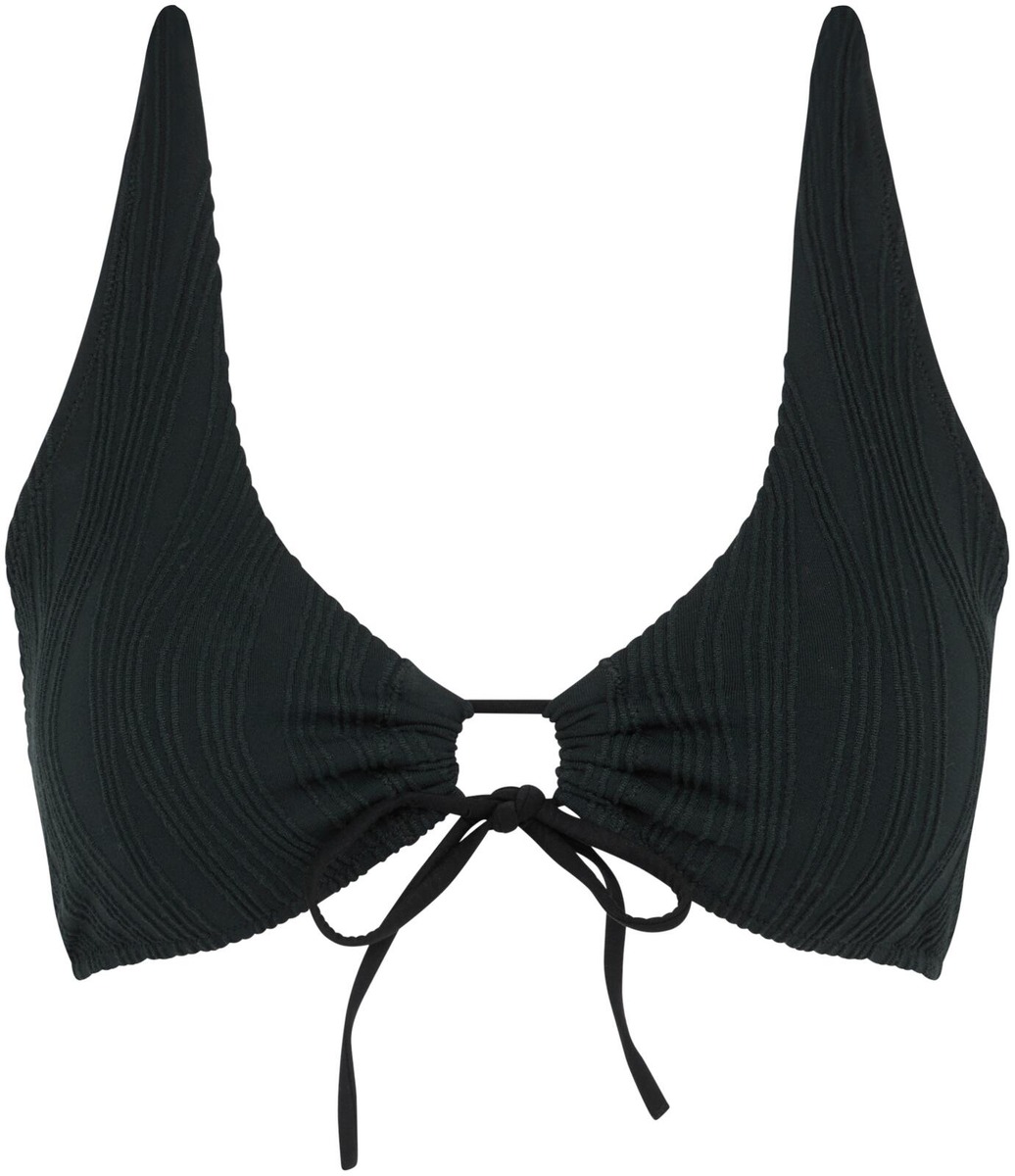 Elegantti ja moderni bikinitoppi, jossa on syvään uurrettu leikkaus ja solmukohta keskellä. Valmistettu joustavasta, teksturoidusta kankaasta, joka mukautuu kauniisti vartalon muotoihin. Mukavuuden takaavat irrotettavat kupit ja metallittomat, pehmeät rakenteet.