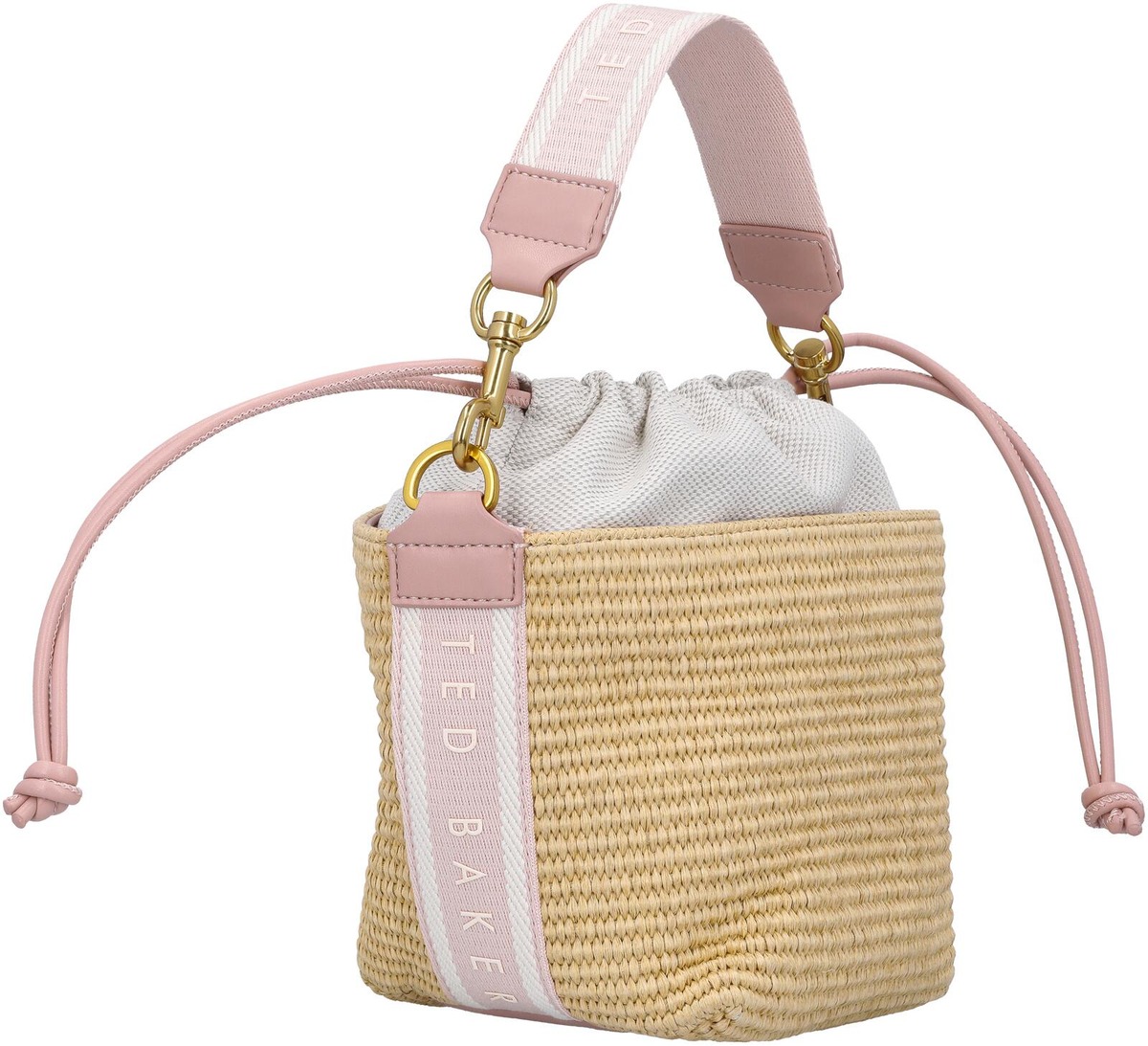 Irrotettava canvaskahva ja pitkä olkahihna. Pintamateriaali keinoraffiaa.
