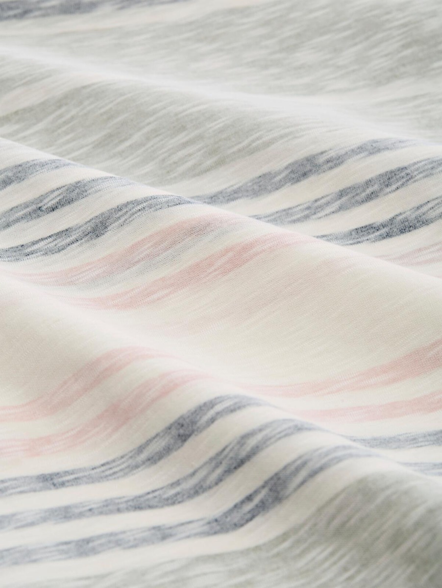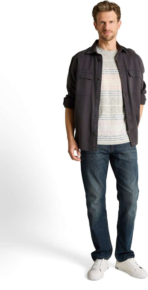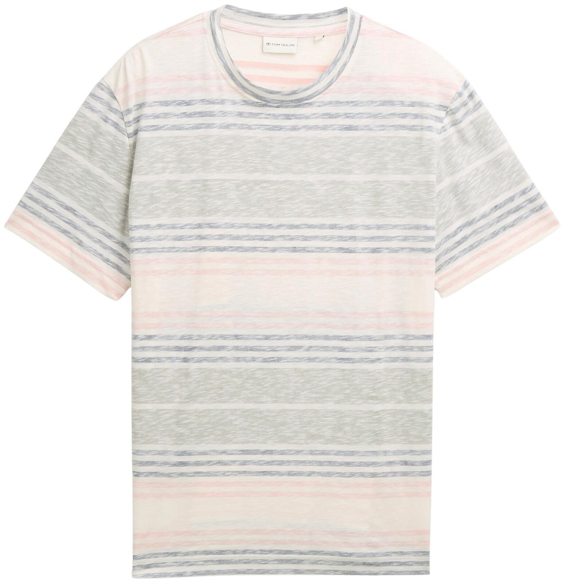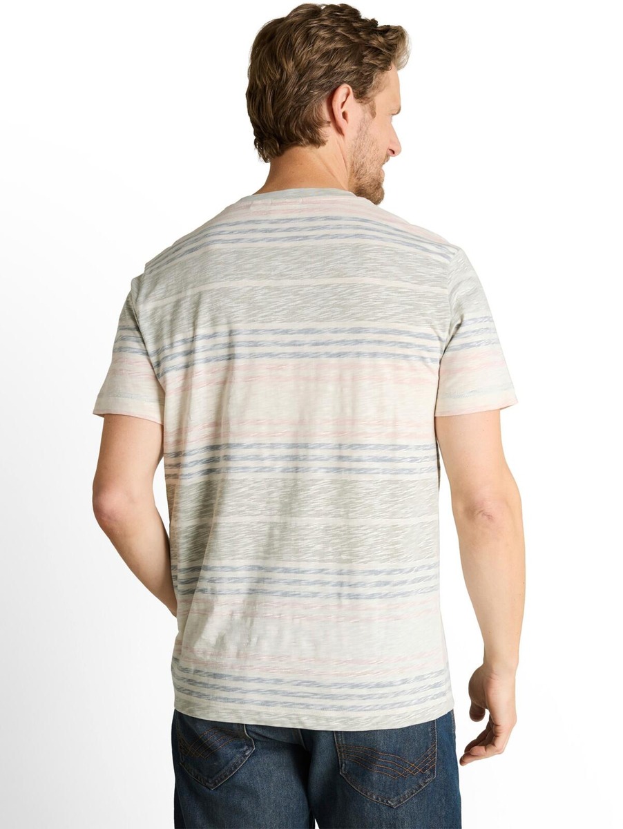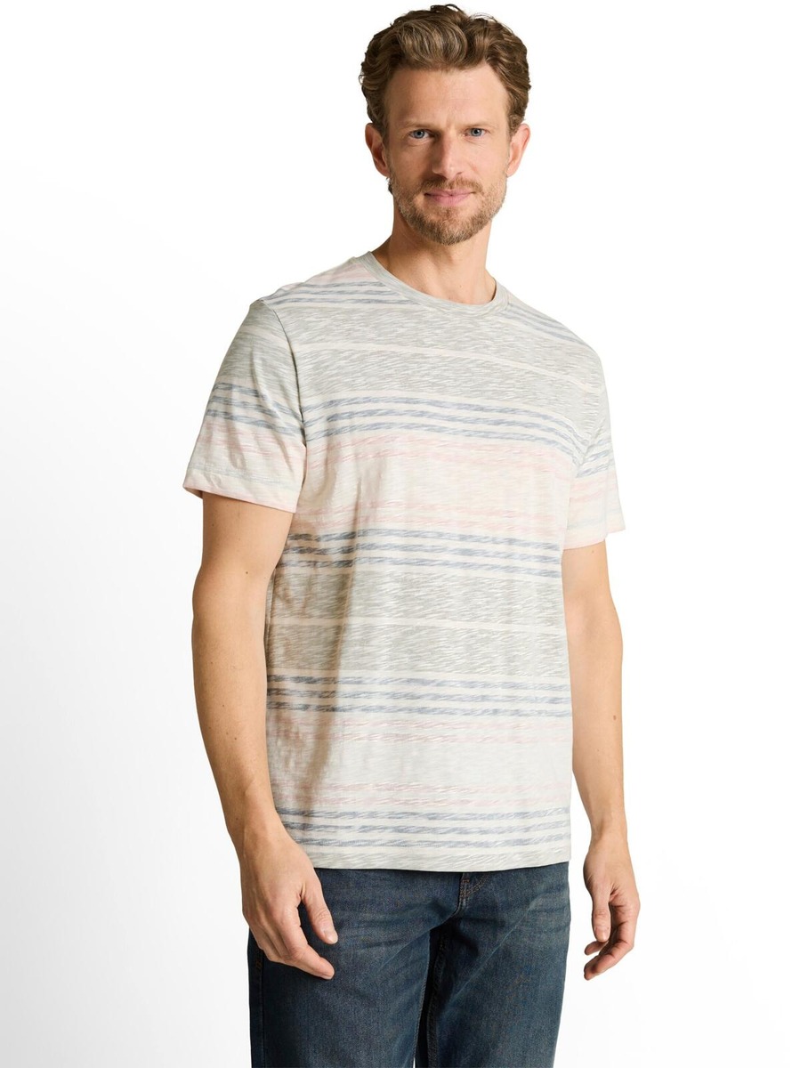 Miesten lyhythihainen raidallinen t-paita O-aukolla. Raidat on painettu puuvillaneuloksen nurjalle puolelle.
