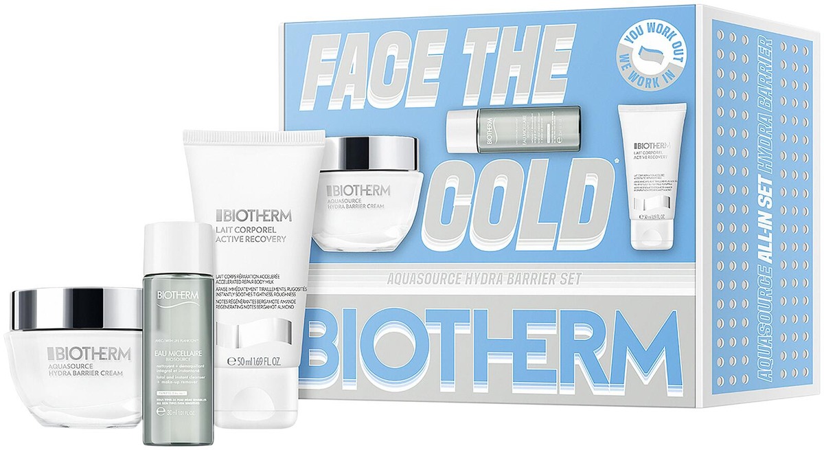 Hydra Barrier Set 2026 sisältää Aquasource Hydra-Barrier Moisturizing Cream 50ml, Biosource Eau Micellaire 30ml ja Lait Corporel Active Recovery 50ml. - AQUASOURCE HYDRA-BARRIER MOISTURIZING CREAM 50ML: Biotherm Aquasource Hydra Barrier Cream 50 ml kasvoille sisältää Biotherm-keramideja, jotka auttavat vahvistamaan ihon suojamuuria ja kosteuttaa ihoa. Aquasource Hydra Barrier Cream antaa 48 tunnin* intensiivisen kosteutuksen ja vahvistaa ihoa, jolloin se näyttää vahvemmalta ja terveemmältä. Tämä kosteuttava kasvovoide on suunniteltu vahvistamaan ihoa, joten se jää hyvin kosteutetuksi ja vahvemmaksi jo tunnin kuluttua*. *Instrumentaaliset testit. - BIOSOURCE EAU MICELLAIRE 30ML: Raikas misellivesi, joka puhdistaa ja poistaa meikin kasvoilta ja silmiltä. Rikastettu Life Plankton™ -uutteella ja jättää ihon heleäksi. - LAIT CORPOREL ACTIVE RECOVERY 50ML: Biothermin Lait Corporel Active Recovery Body Milk on kehitetty Biothermin asiantuntemuksen pohjalta antamaan kosteutta ja vahvistamaan ihon suojamuuria. Kehittynyt koostumus, joka sisältää tärkeitä ainesosia kuten Biothermtech Plankton™, B3-vitamiinia, E-vitamiinia ja B5-Pro-vitamiinia, auttaa välittömästi rauhoittamaan kuivaa ja kireän tuntuista ihoa.