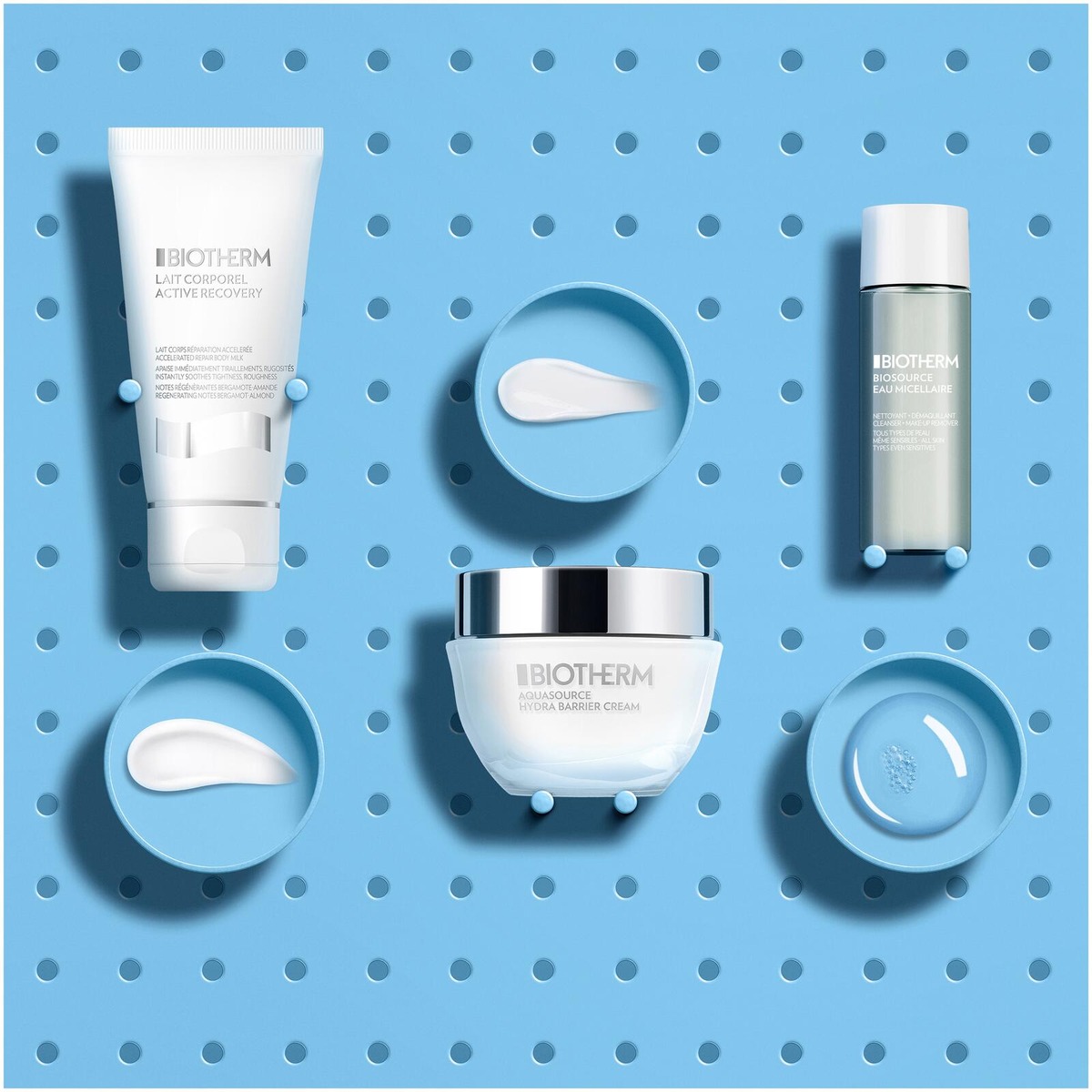 Puhdista: Käytä Biothermsource Eau Micellaire -puhdistusvettä vanulapulla kasvojen ja silmien puhdistamiseen. Kosteuta kasvot: Levitä Aquasource Hydra-Barrier Moisturizing Cream puhtaalle kasvojen iholle. Kosteuta vartalo: Levitä Lait Corporel Active Recovery vartalolle ja hiero kunnes se on imeytynyt.