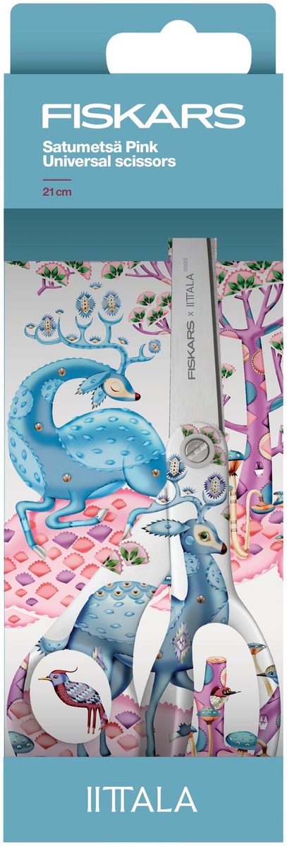 Klaus Haapaniemen mystinen maailma herää eloon Satumetsä-kuvituksella varustetuissa Fiskars-saksissa. Fiskars x Iittala -sarjassa yhdistyvät kaksi design-ikonia, jotka juhlistavat arjen odottamattomia iloja. Nyt meillä on kunnia tuoda saksiimme myös Haapaniemen mielikuvituksellinen ja monitasoinen Satumetsä-kuvitus. Fiskars-yleissakset sopivat useimpiin leikkuutöihin kotona, koulussa ja toimistolla. Terävät korkealaatuiset terästerät takaavat pitkäkestoisen leikkuutehon. Ergonomisesti muotoiltu, mukava kahva tarjoaa hyvän hallinnan. Kaikki Fiskars-sakset testataan käsin ennen tehtaalta lähtöään ensiluokkaisen ja pitkäikäisen laadun takaamiseksi. Valmistettu Suomen Billnäsissä rautaisella ammattitaidolla.