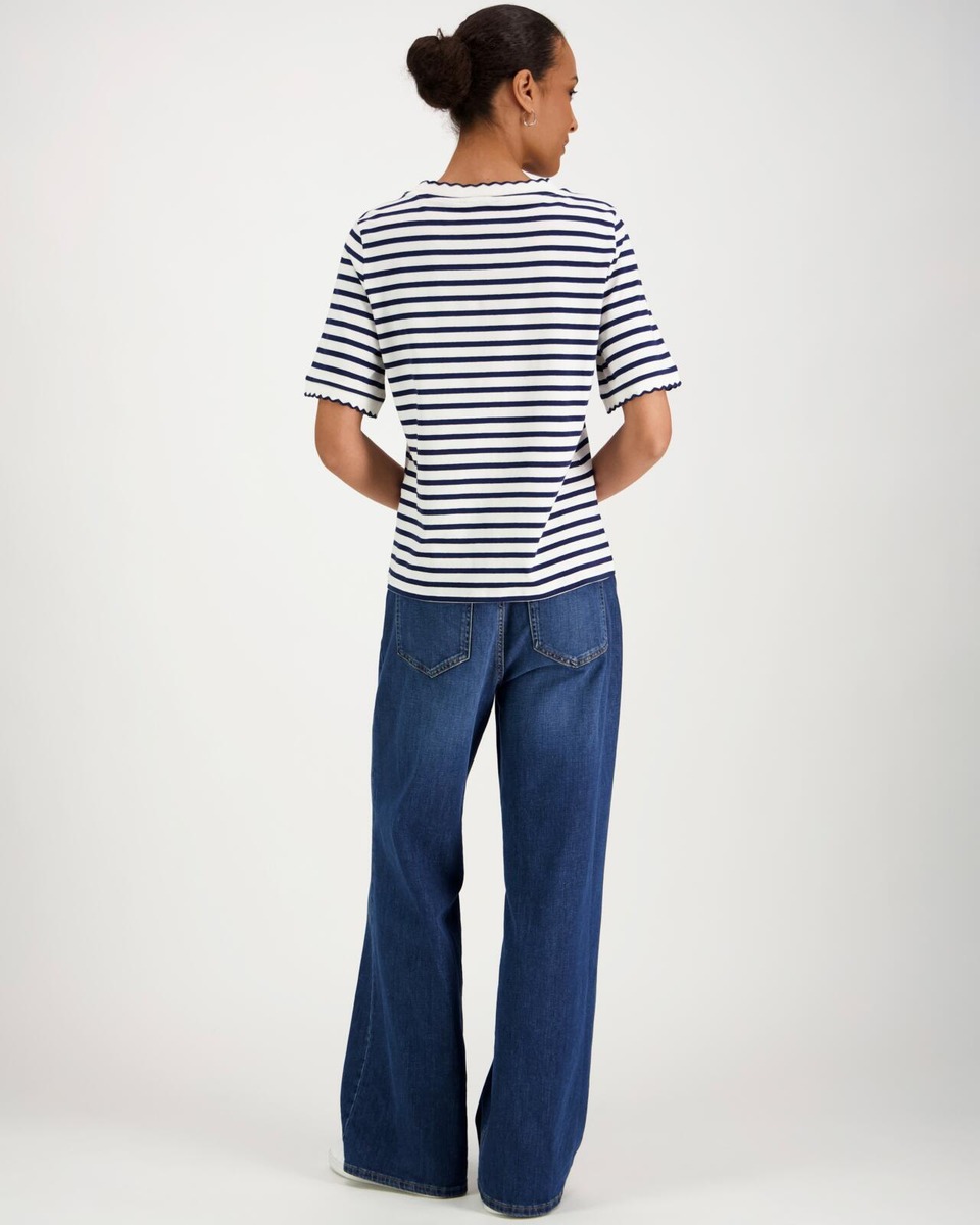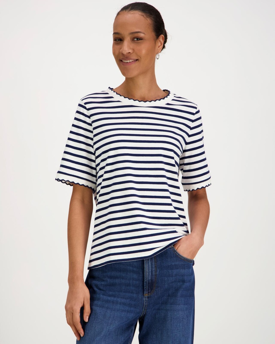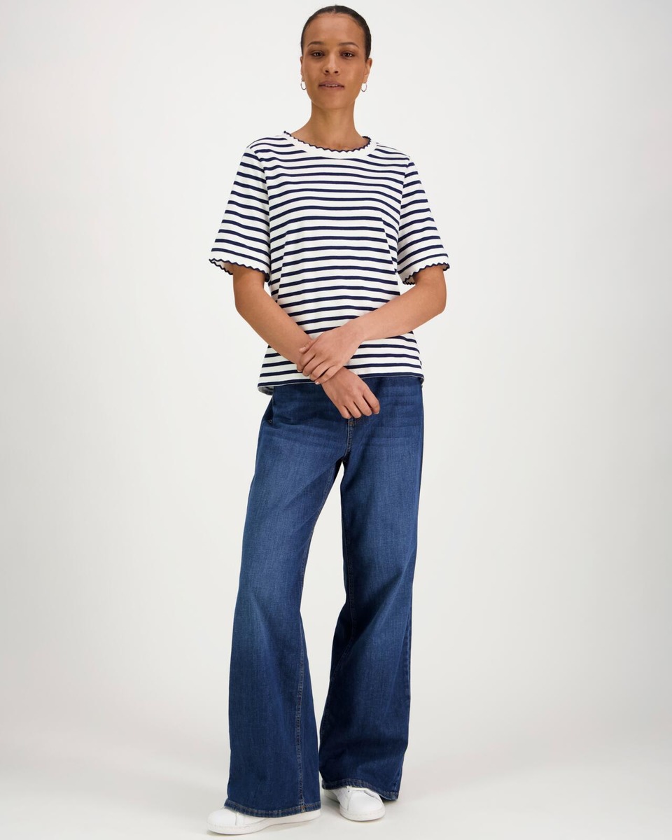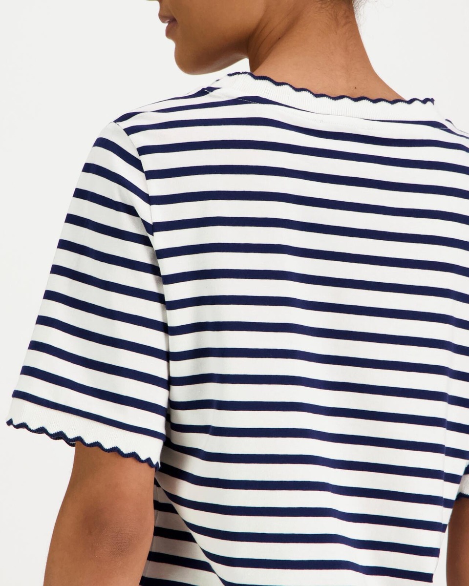 Naisellinen raitapaita, jonka materiaali on vahvaa orgaanista puuvillaa, mukana myös elastaania.Hihansuissa ja kaula-aukossa rypytys.