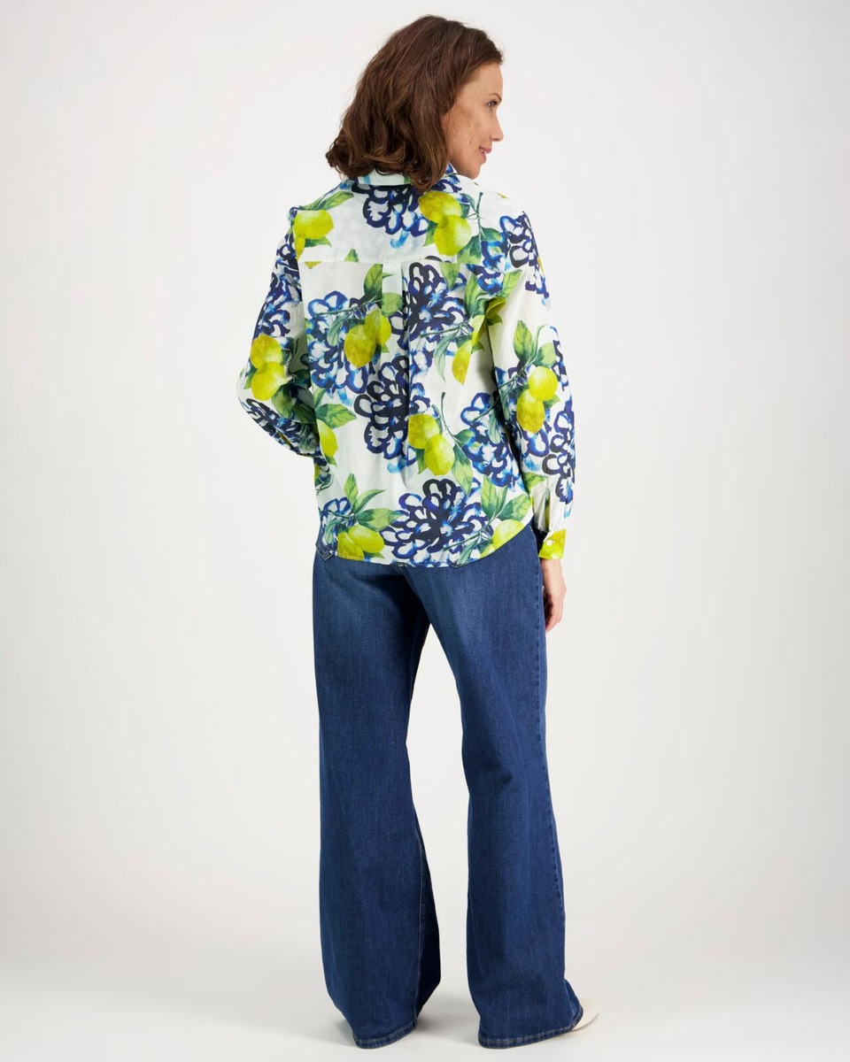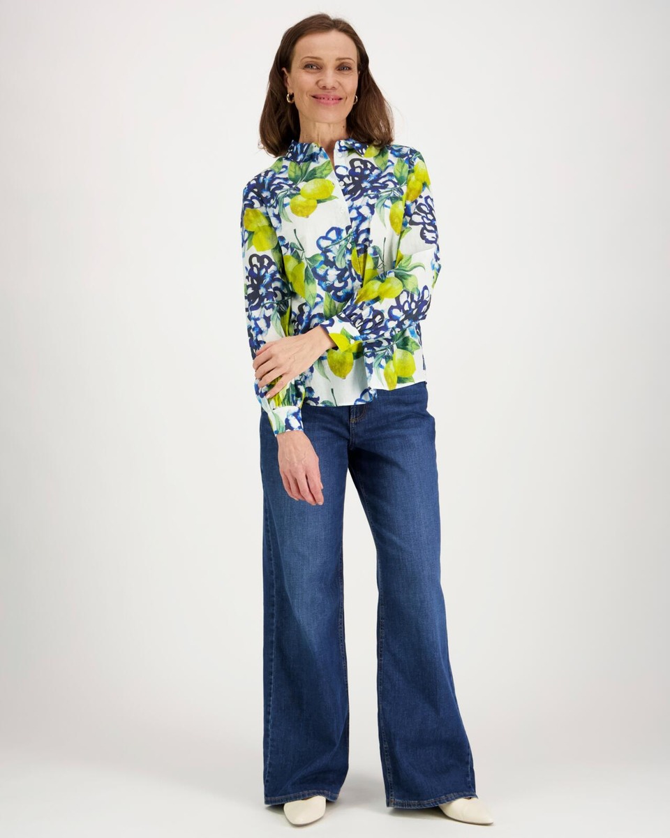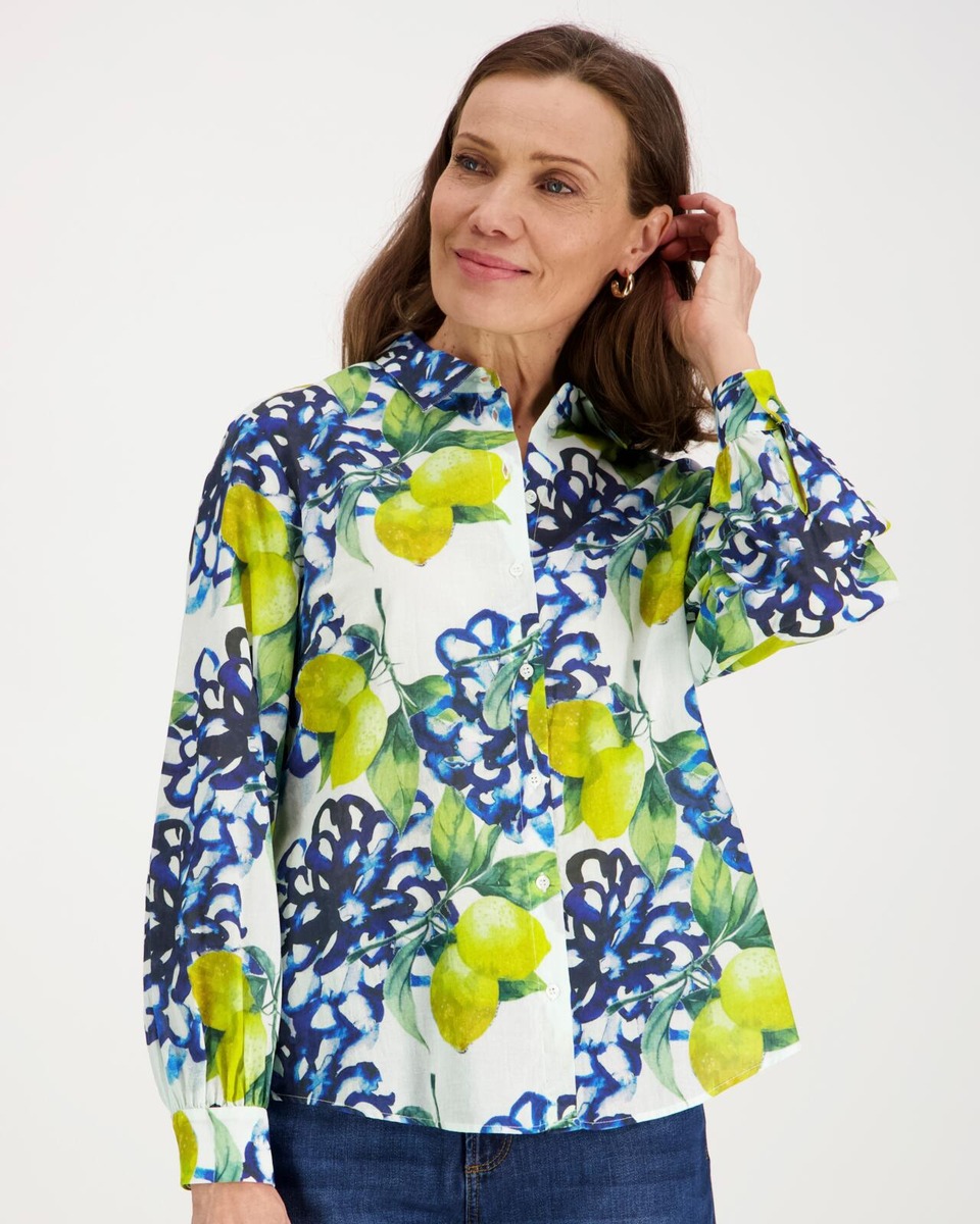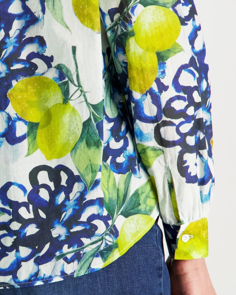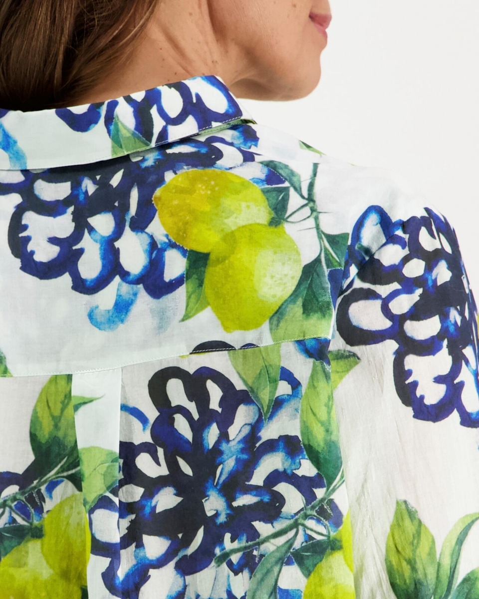Ihanan kevyt puuvillavoile paitapusero. Printtinä vesivärimäinen sitruuna. Napit alasasti. Pusero on vuoreton.
