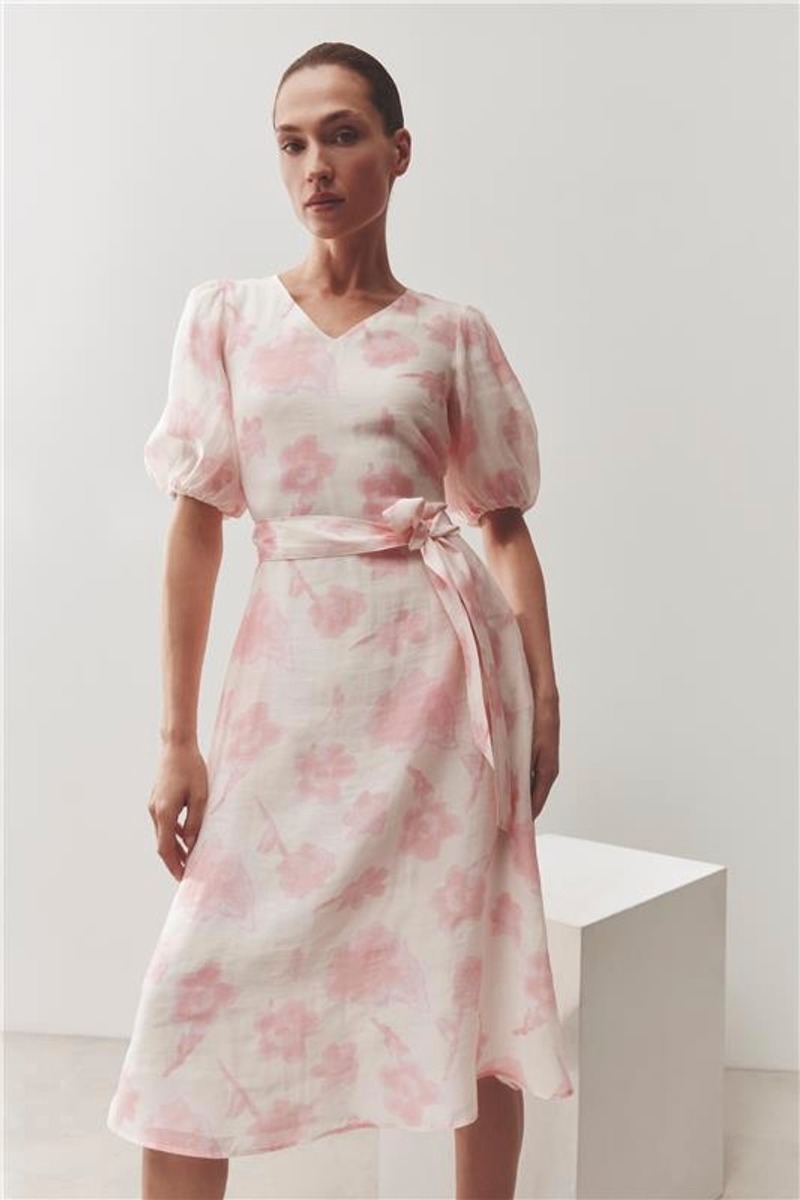 Vaaleanpunainen kukkamekko, jossa on vyötärölle sidottava nauha. Puhvihihat tuovat naisellista ilmettä.