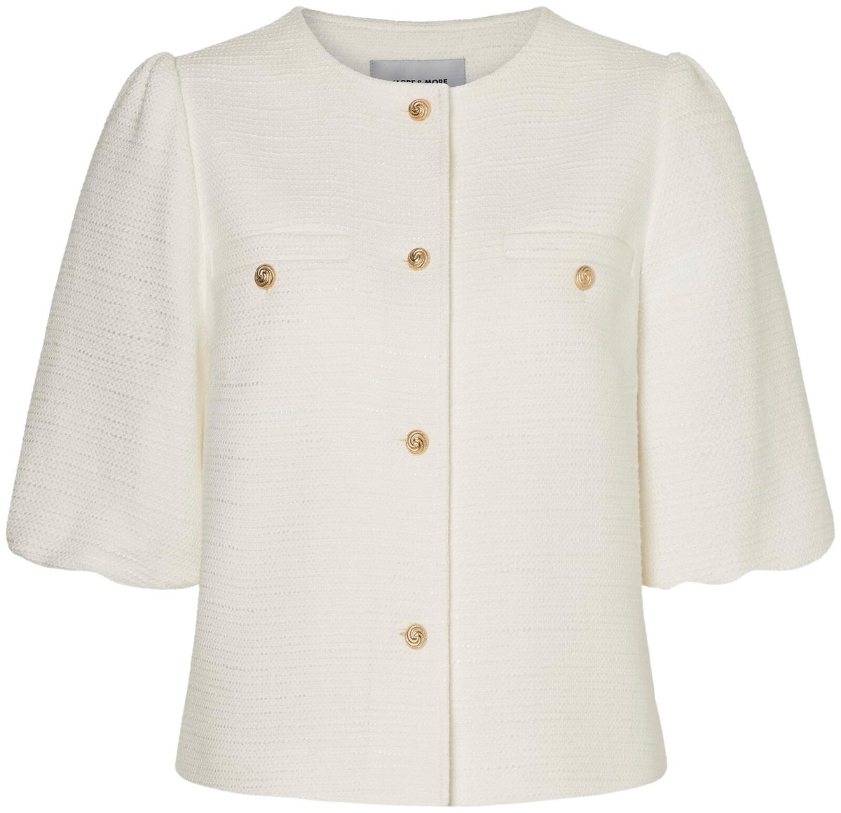 Elegantti jakku, jossa on hienostunut teksturoitu pinta ja kultaiset napit. Suoralinjainen malli ilman kaulusta.