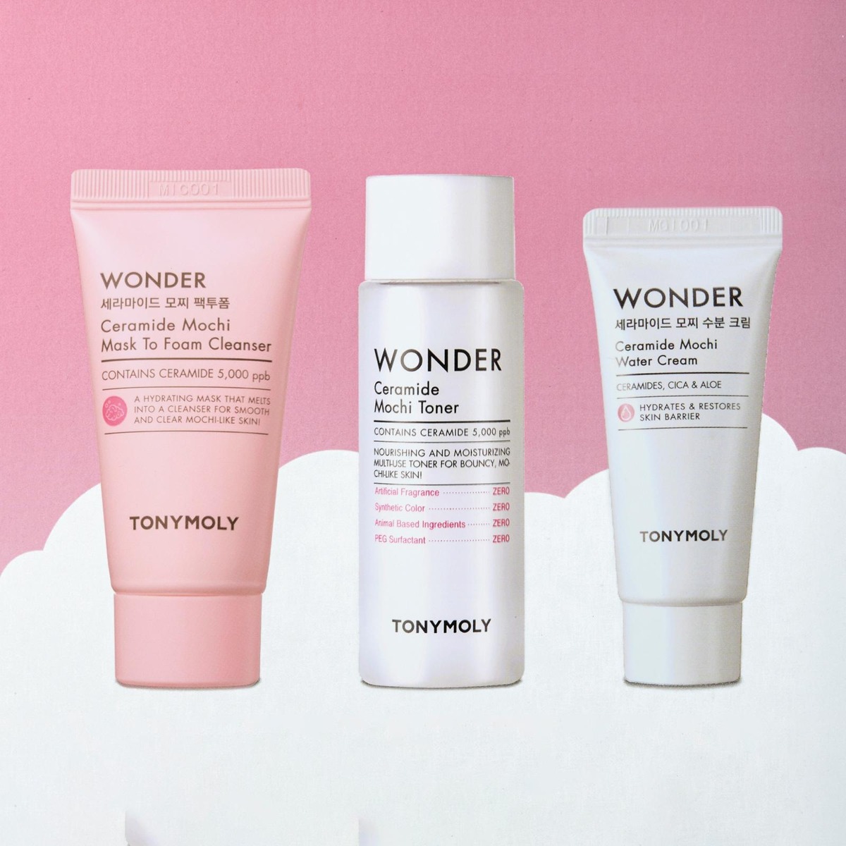 TONYMOLY WONDER Ceramide Mochi Travel Kit on kolmen vaiheen matkakokoinen ihonhoitorutiini, joka kosteuttaa, ravitsee ja vahvistaa ihoa jättäen sen pehmeäksi, sileäksi ja mochimaisen kimmoisaksi – missä ikinä oletkin!