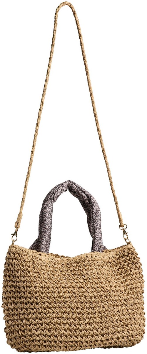 Kahvat pinnoitettu leapardikuosisella kankaalla. Irrotettava olkahihna. Vuori sisällä, suljetaan magneettinepillä.