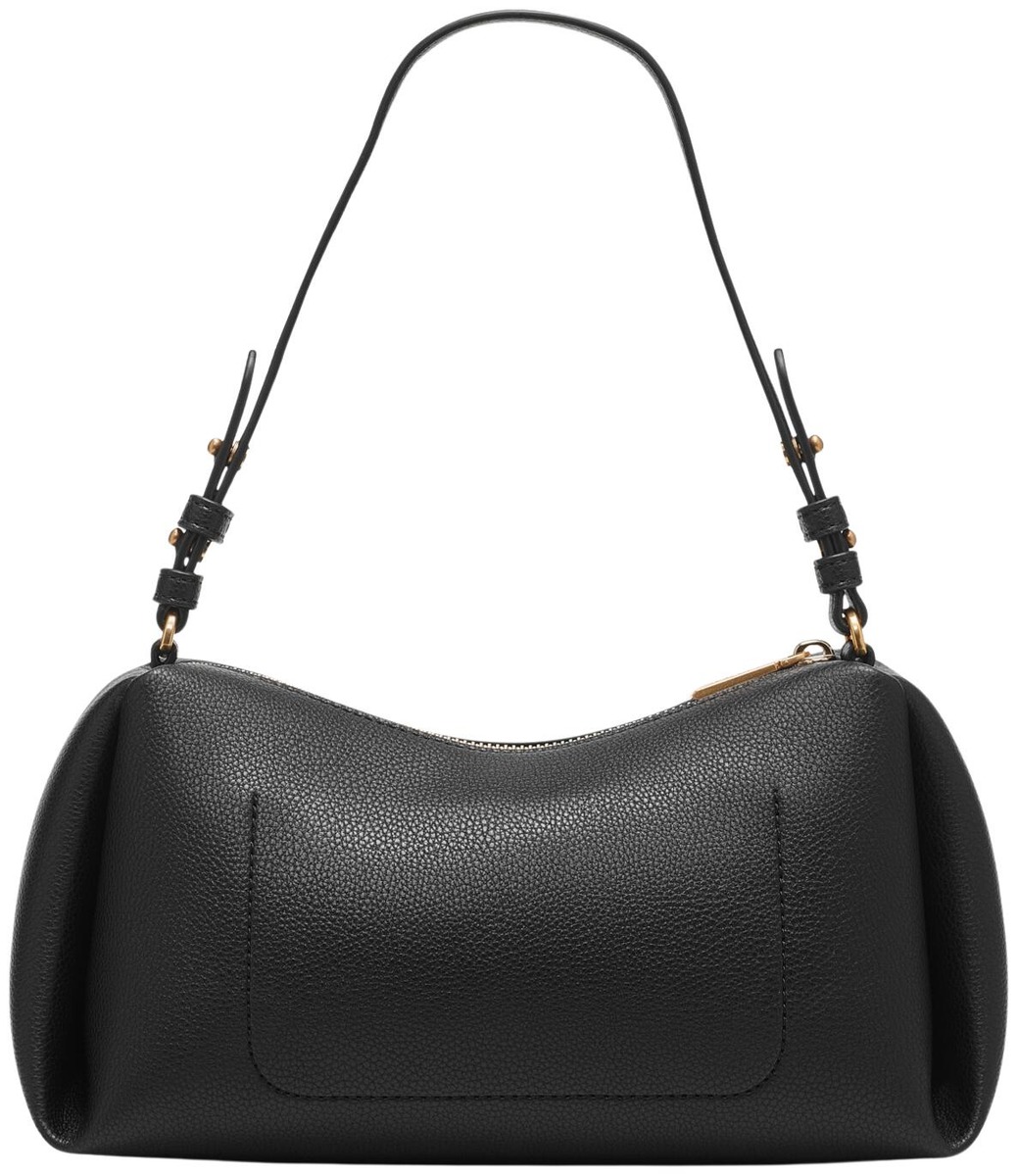Lyhyt, hieman säädettävä olkahihna, sisällä avotasku. Suljetaan vetoketjulla.