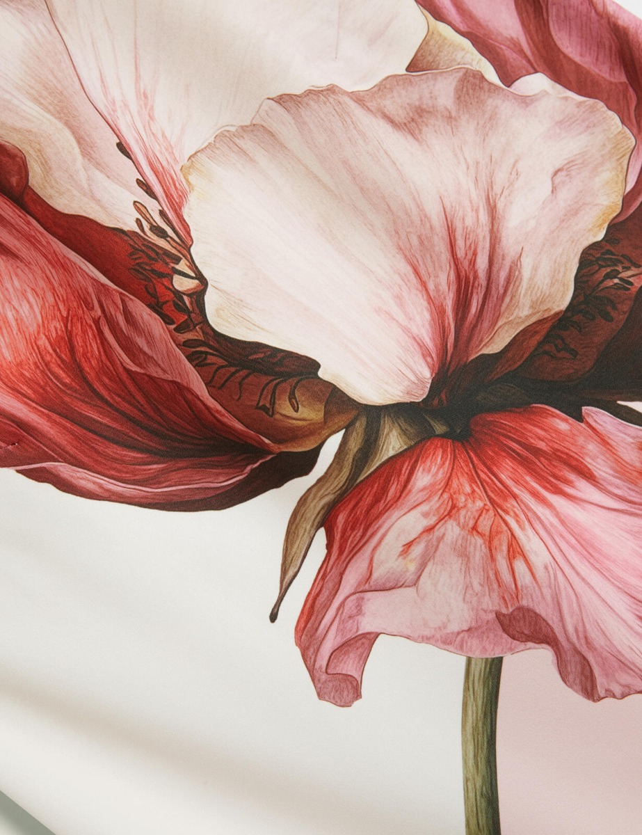Pidempi hihtaon mekko, jossa upea iso kukkakuvio edessä.