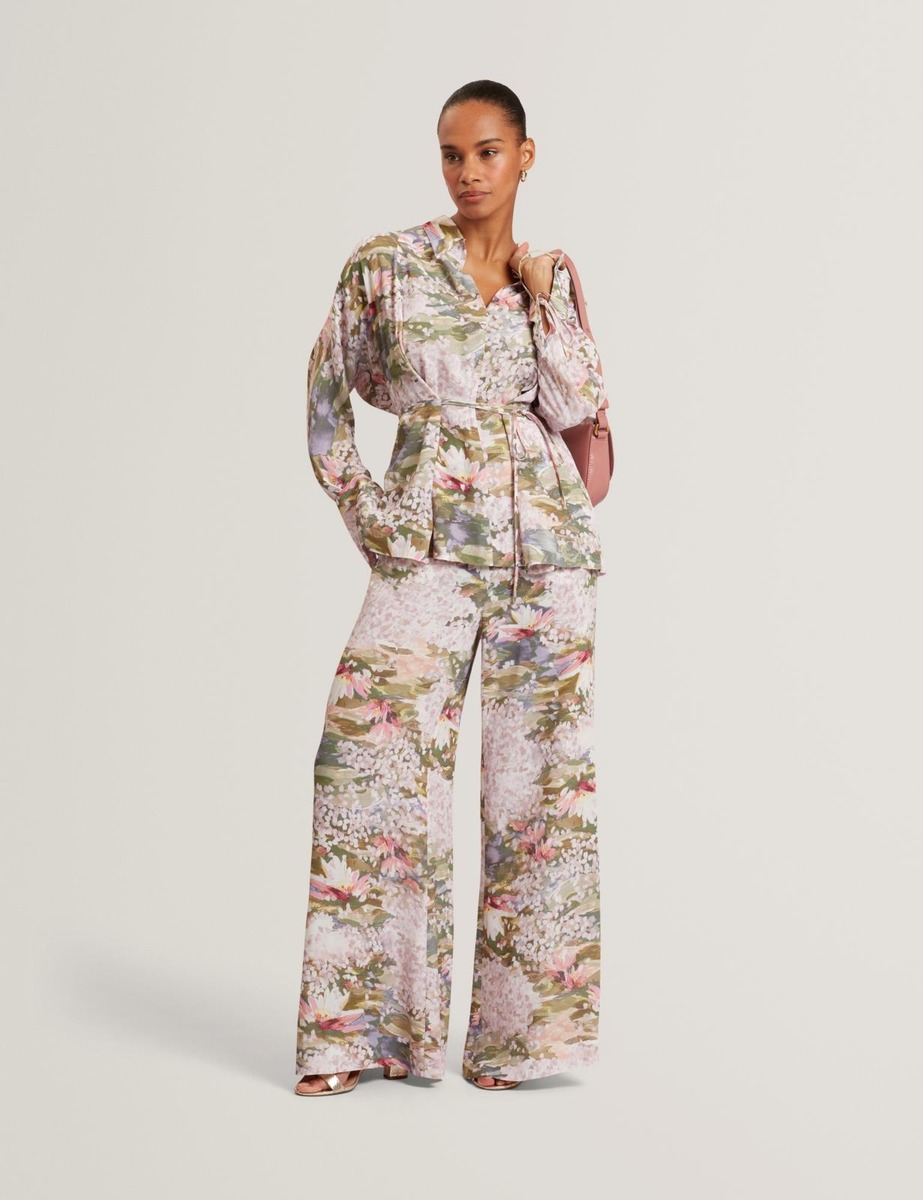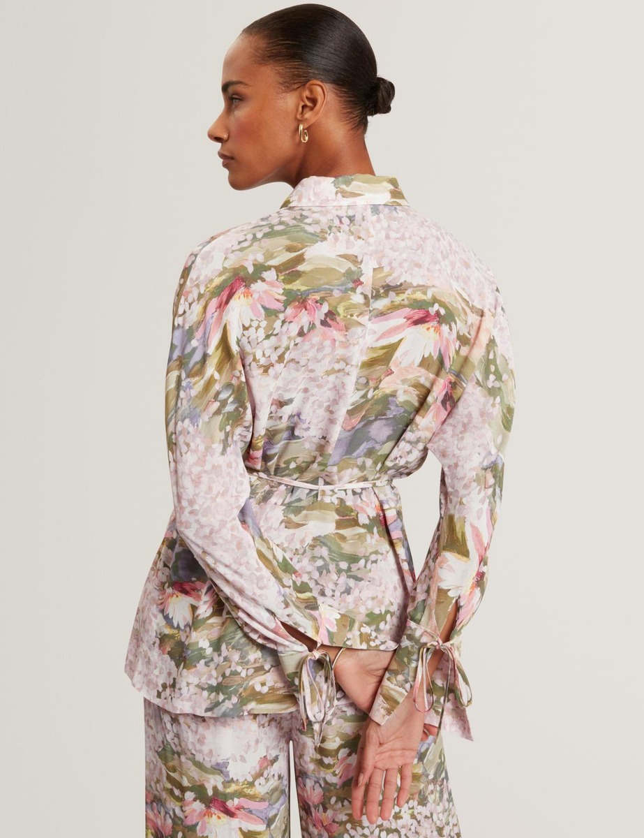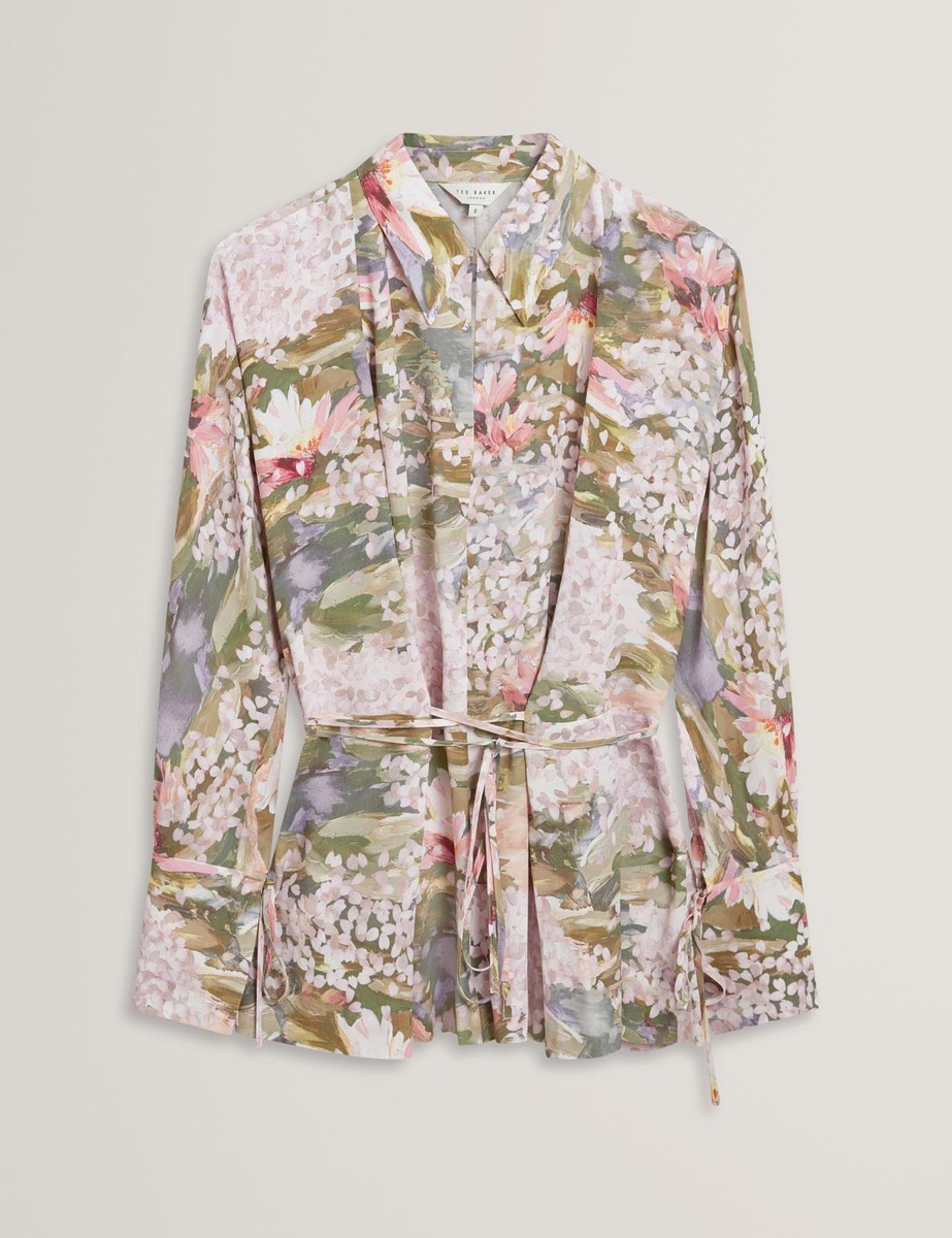 Kaunis kukkaprintillinen kauluspaita laskeutuvaa materiaalia ja siinä on ohut solmittava kangas nauha.