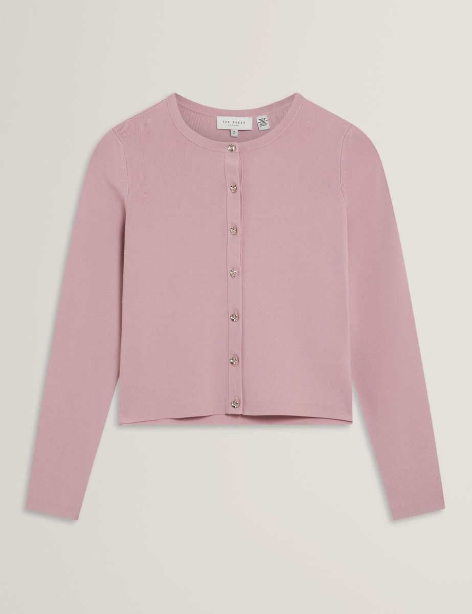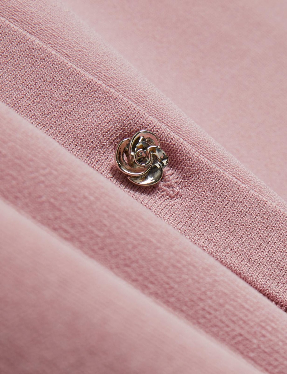 Yksinkertainen neuletakki, jossa upeana yksityiskohtana kukkanapit.